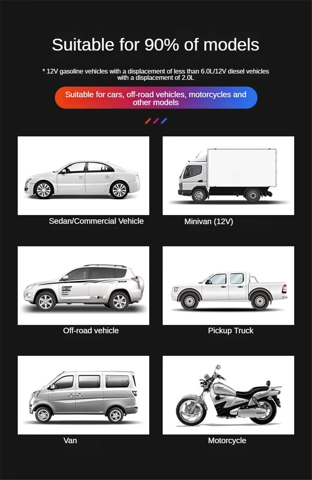 90% de modelos adecuados: automóviles adecuados, vehículos todoterreno, motocicletas y otros modelos, vehículos de gasolina de 12V con un desplazamiento de menos de 6.0L/vehículos diésel de 12V con un desplazamiento de 2.0L