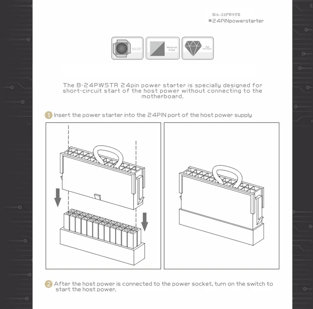 Instrucciones de uso: Simplemente conéctelo al conector macho de 24 Pines de la salida de alimentación. Cuando se enciende el interruptor de arranque, los cables verde y negro de la fuente de alimentación se cortocircuitarán, que es lo mismo que la señal de la placa base presionando el botón de encendido. En este momento, la fuente de alimentación comienza a funcionar de forma independiente. El principio del dispositivo es simular la placa base para dar una señal de encendido a la fuente de alimentación para que funcione