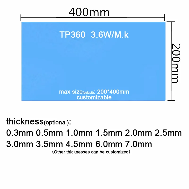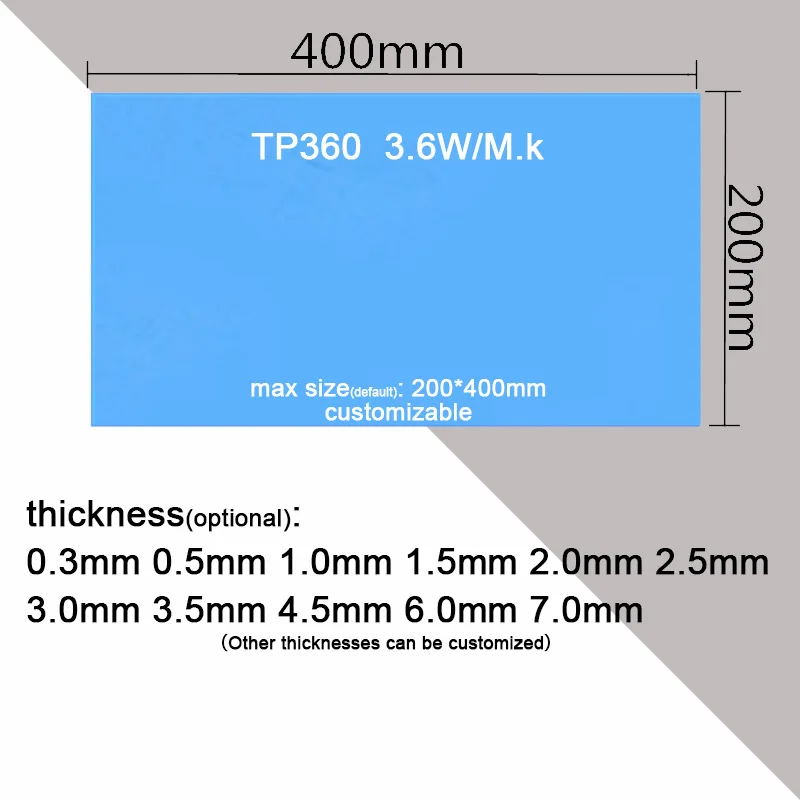 Almohadilla de silicona conductora térmica serie TP360-Características principales:◆Thermal conductividad: 3,6 W/mK◆High aislamiento eléctrico◆ Baja tasa de exudación de aceite de silicona◆Low de compresión de la aplicación de la fuerza◆ Baja fuerza de compresión con alta relación de compresión◆ Autoadhesivo de doble cara (ligeramente)◆Good resistencia a la temperatura◆ Combinado con un alto rendimiento de disipación de calor y rentabilidadTamaño: 400x200mmGrosor: 2,0mm, 2,5mm, 3,0mm, 4,5mm (otros grosores hacen clic en la imagen de arriba)Conductor: no conductor