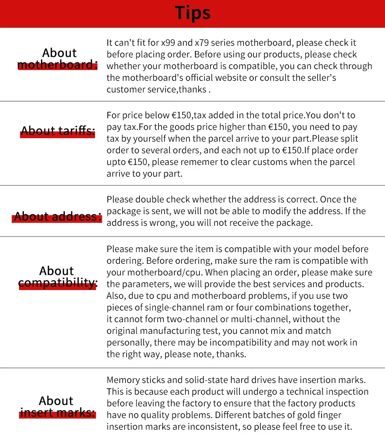 Si la placa base y la CPU no admiten el estándar de cambio, la memoria solo podrá funcionar a 2666 MHZ/2400 MHZ.Además, debido a los problemas de la CPU y la placa base, para la memoria de 3000 MHz y frecuencia superior de 3000 MHz, si dos piezas de memoria de un solo canal o cuatro combinaciones juntas, es posible que no pueda formar un dos canales o multicanal, sin el original. Prueba de fabricación, puede mezclar y combinar personalmente, puede haber diferencias de coincidencia y no puede funcionar de la manera correcta.