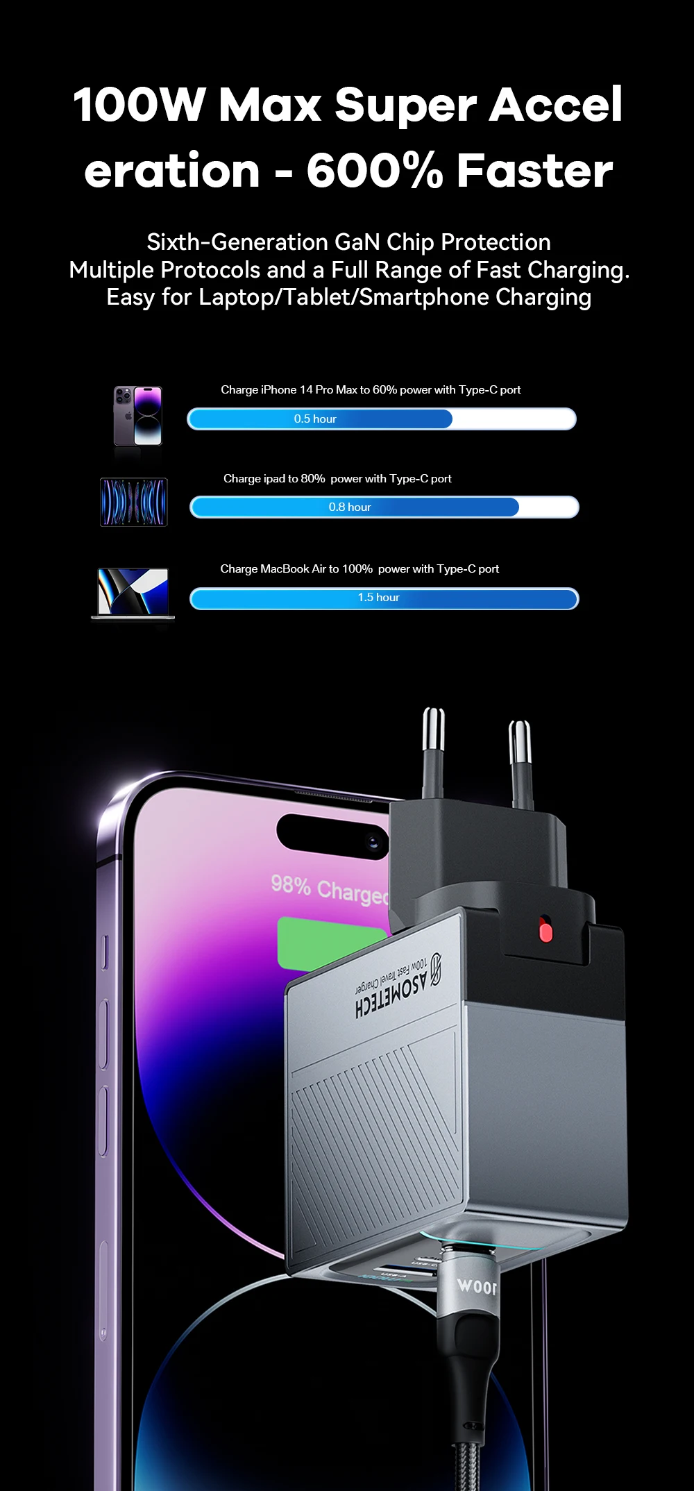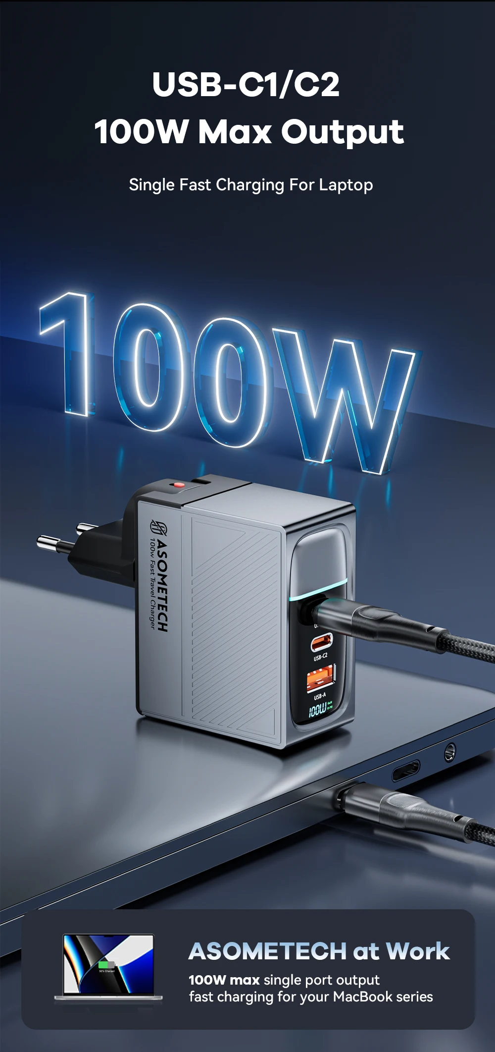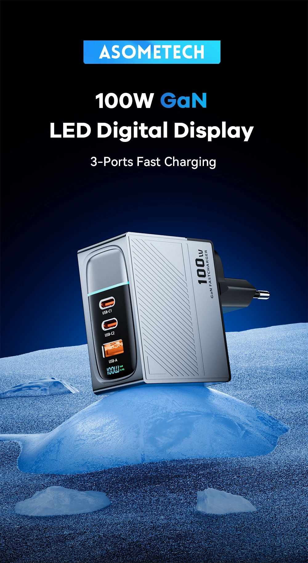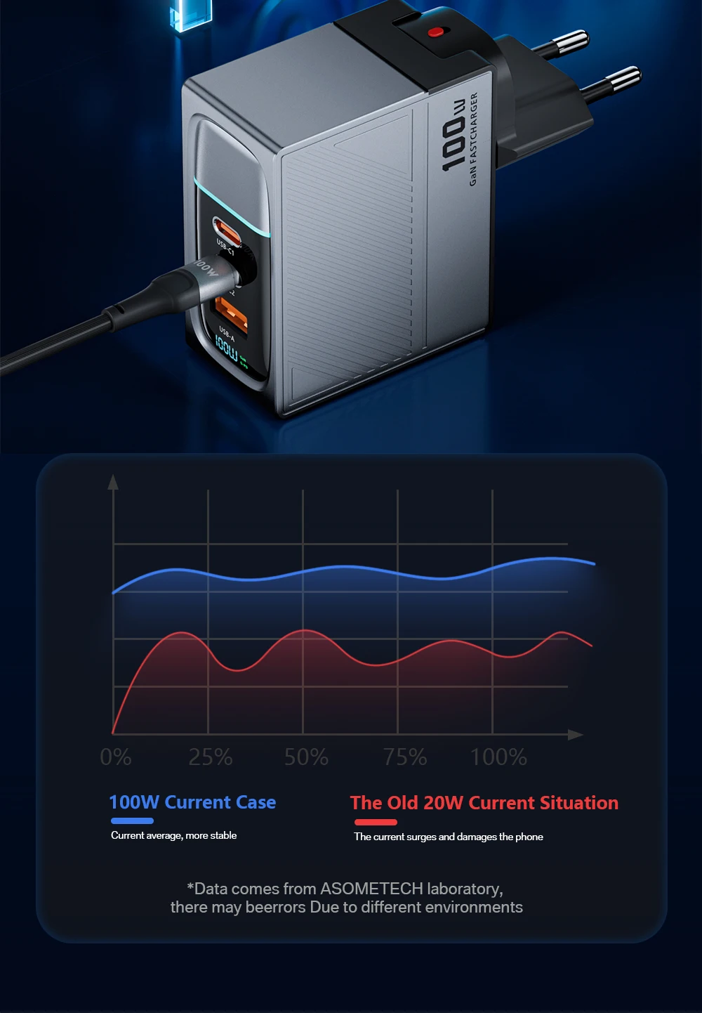 💪【Indicador LED + pantalla digital】: Cargador ASOMTECH 100W con indicador LED de columna y pantalla digital LCD, puede ver el valor de potencia de salida real al cargar.