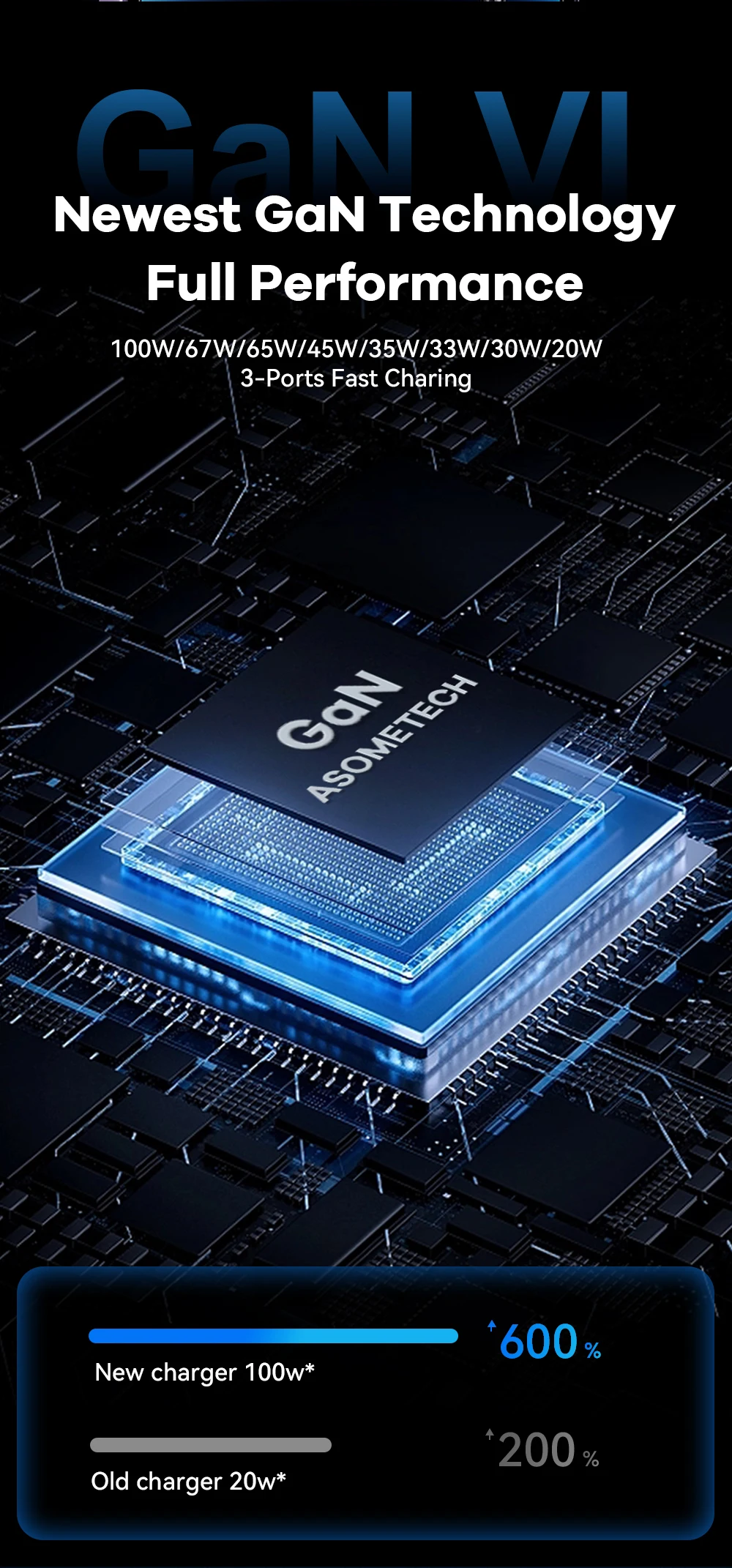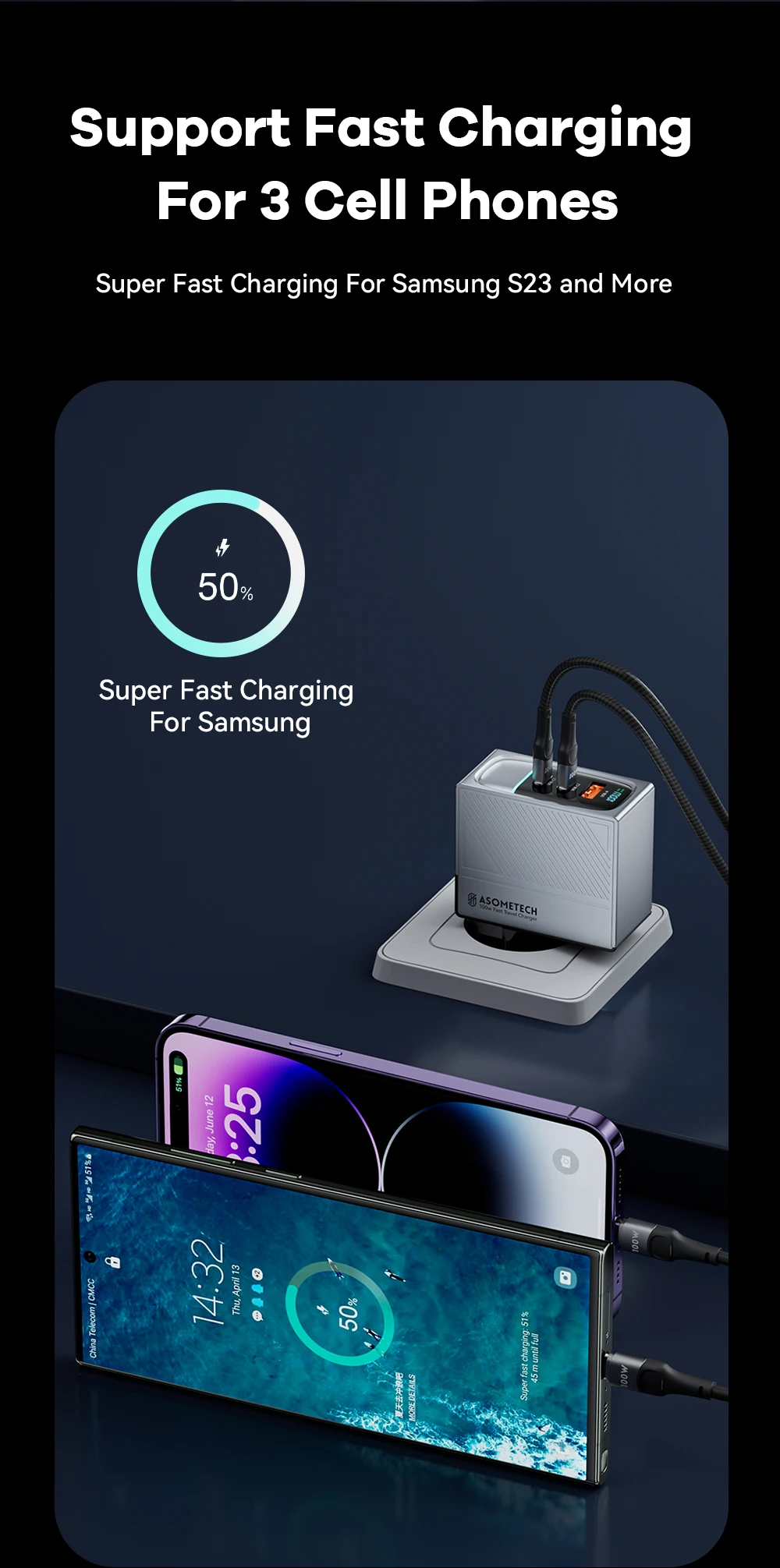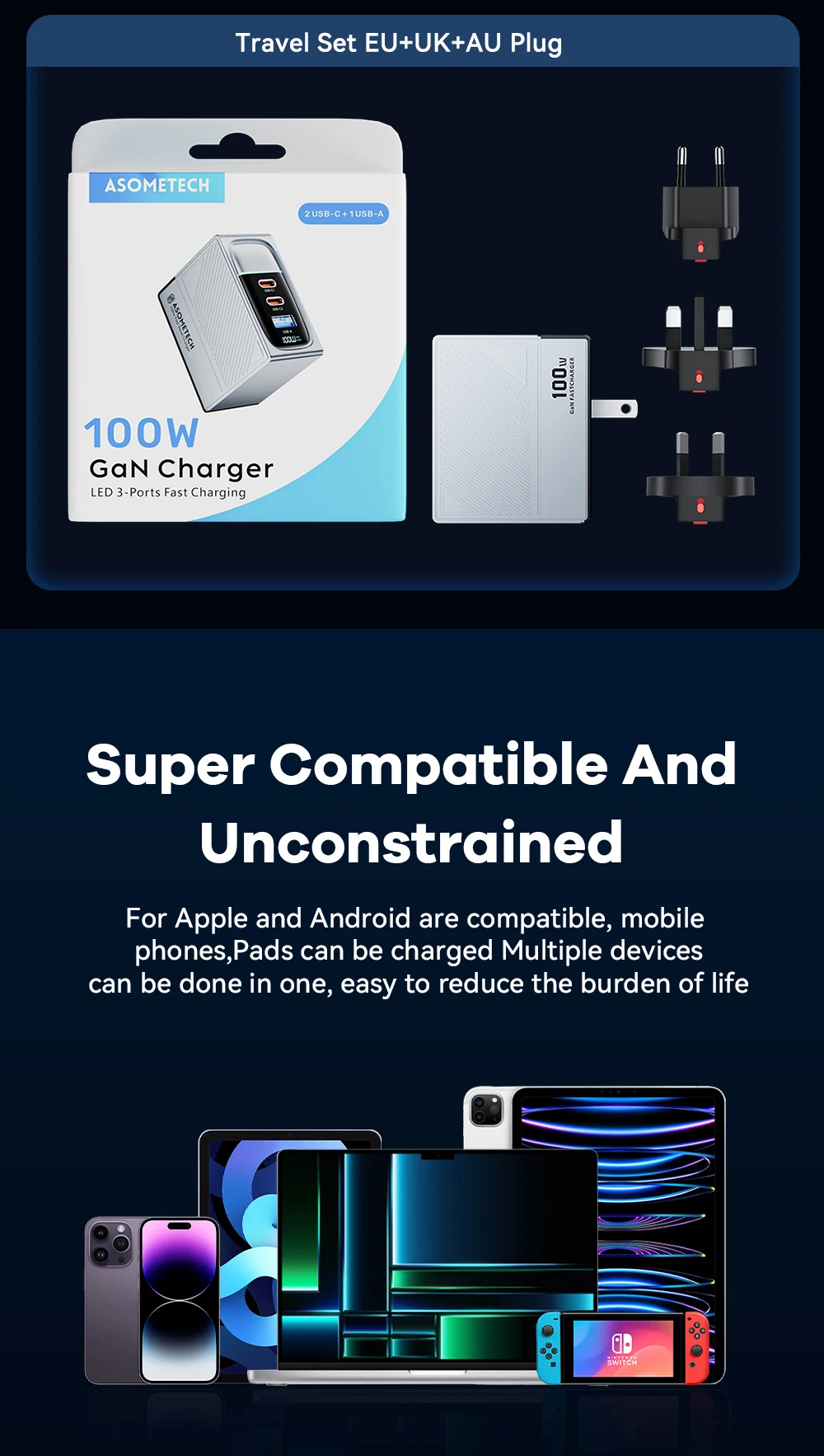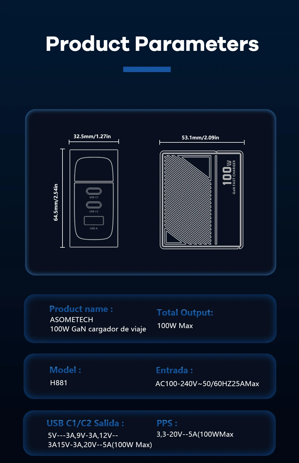 💪【Indicador LED + pantalla digital】: Cargador ASOMTECH 100W con indicador LED de columna y pantalla digital LCD, puede ver el valor de potencia de salida real al cargar.