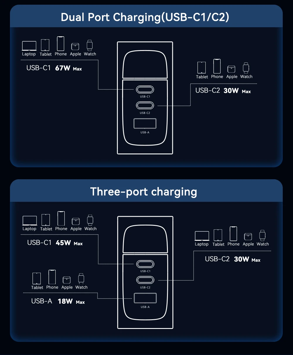 ⚡USB-C1 + C2 Salida: 67W + 30W