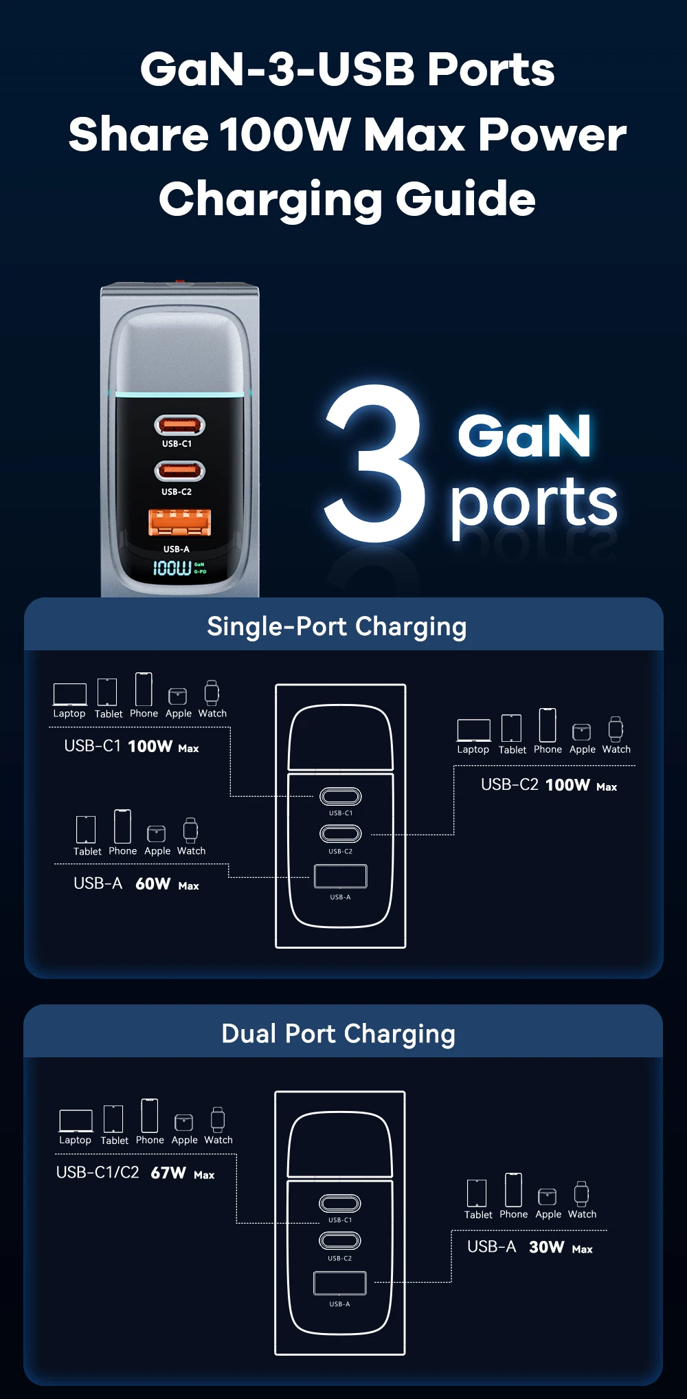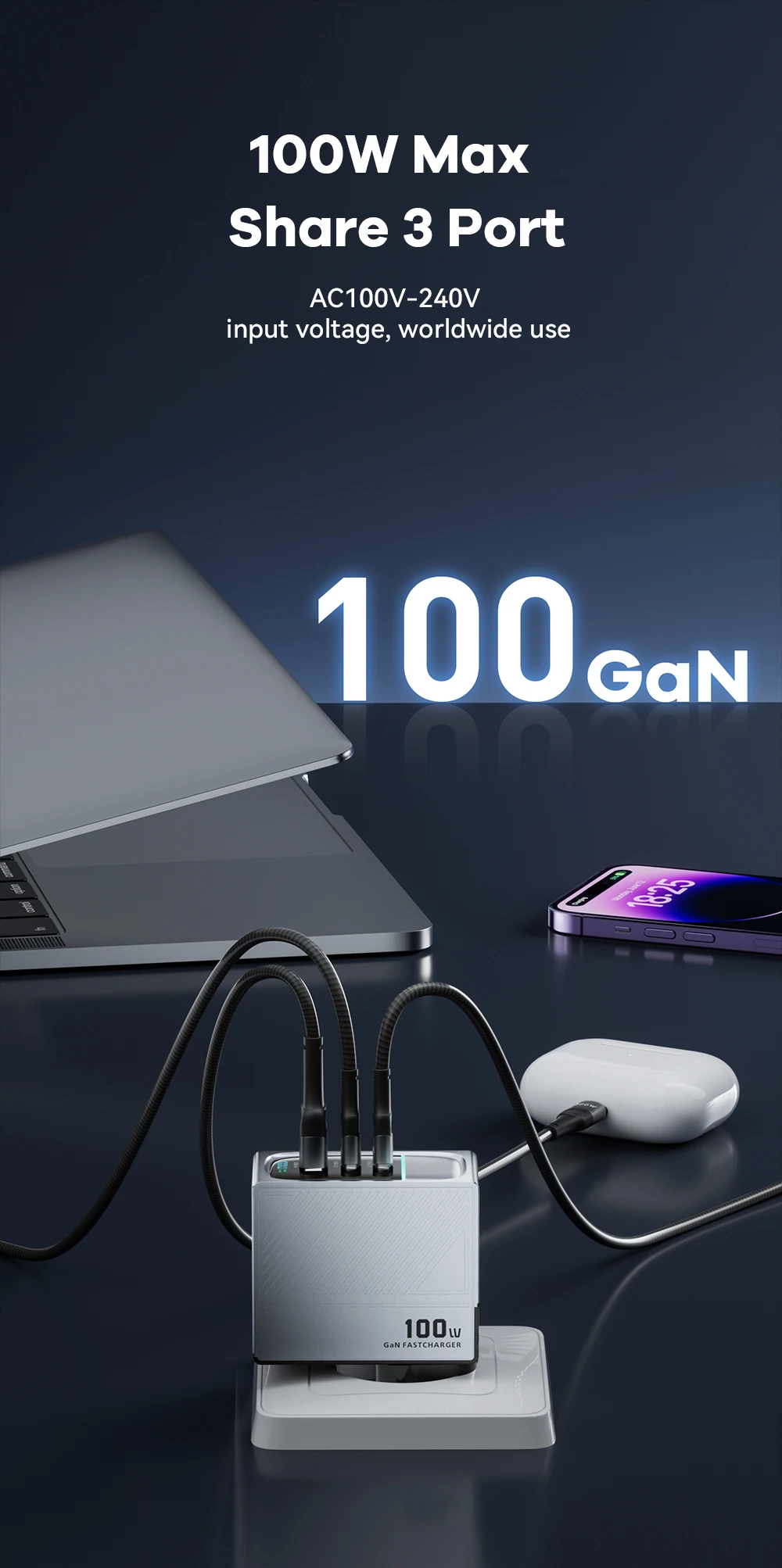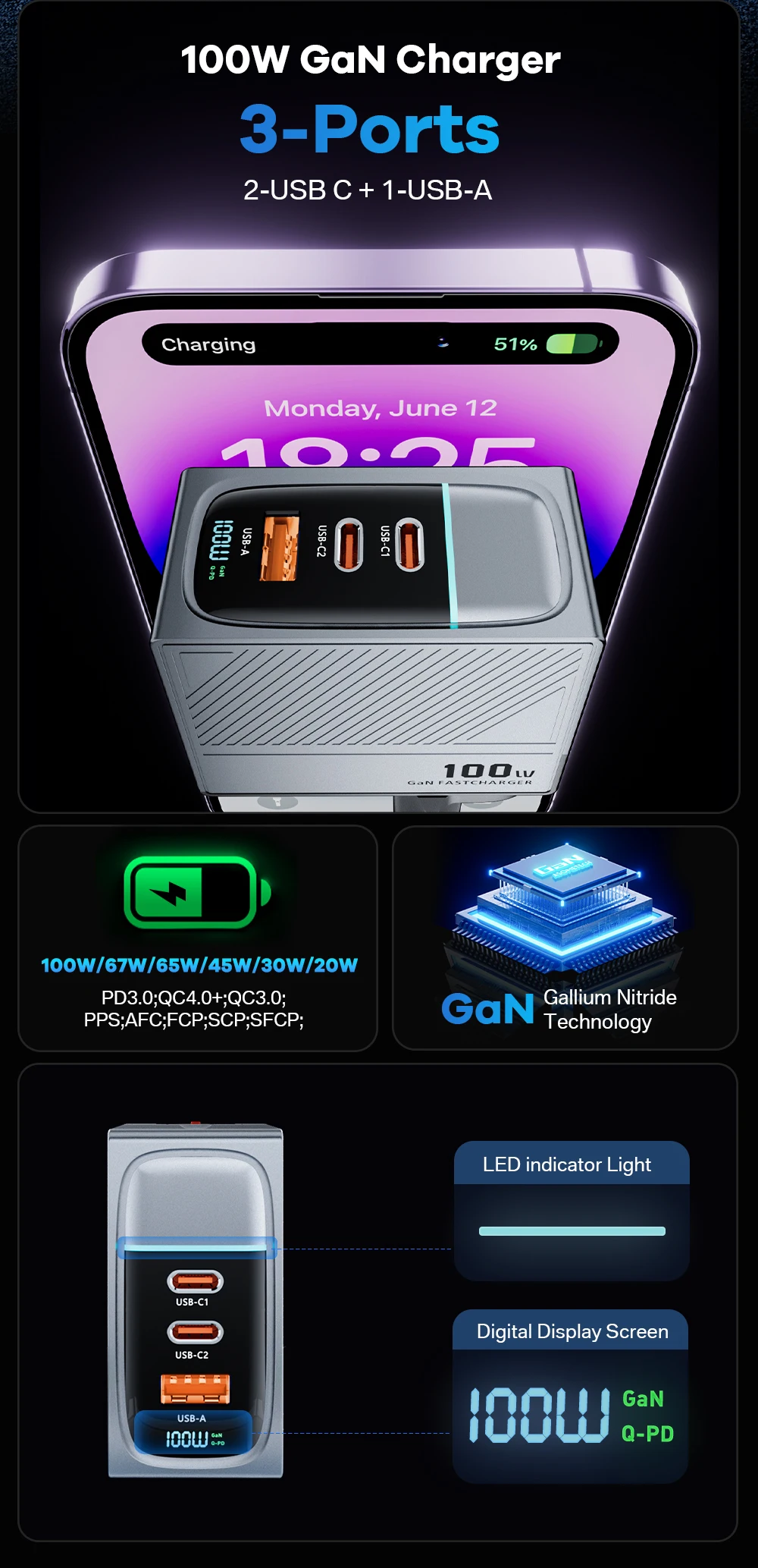 💪【 Cargador multipuerto 3 en 1 】: ¡Dos puertos USB-C y 1 puerto USB-A proporcionan 100W a teléfonos, tabletas, computadoras portátiles y más! Carga rápida todo al mismo tiempo.
