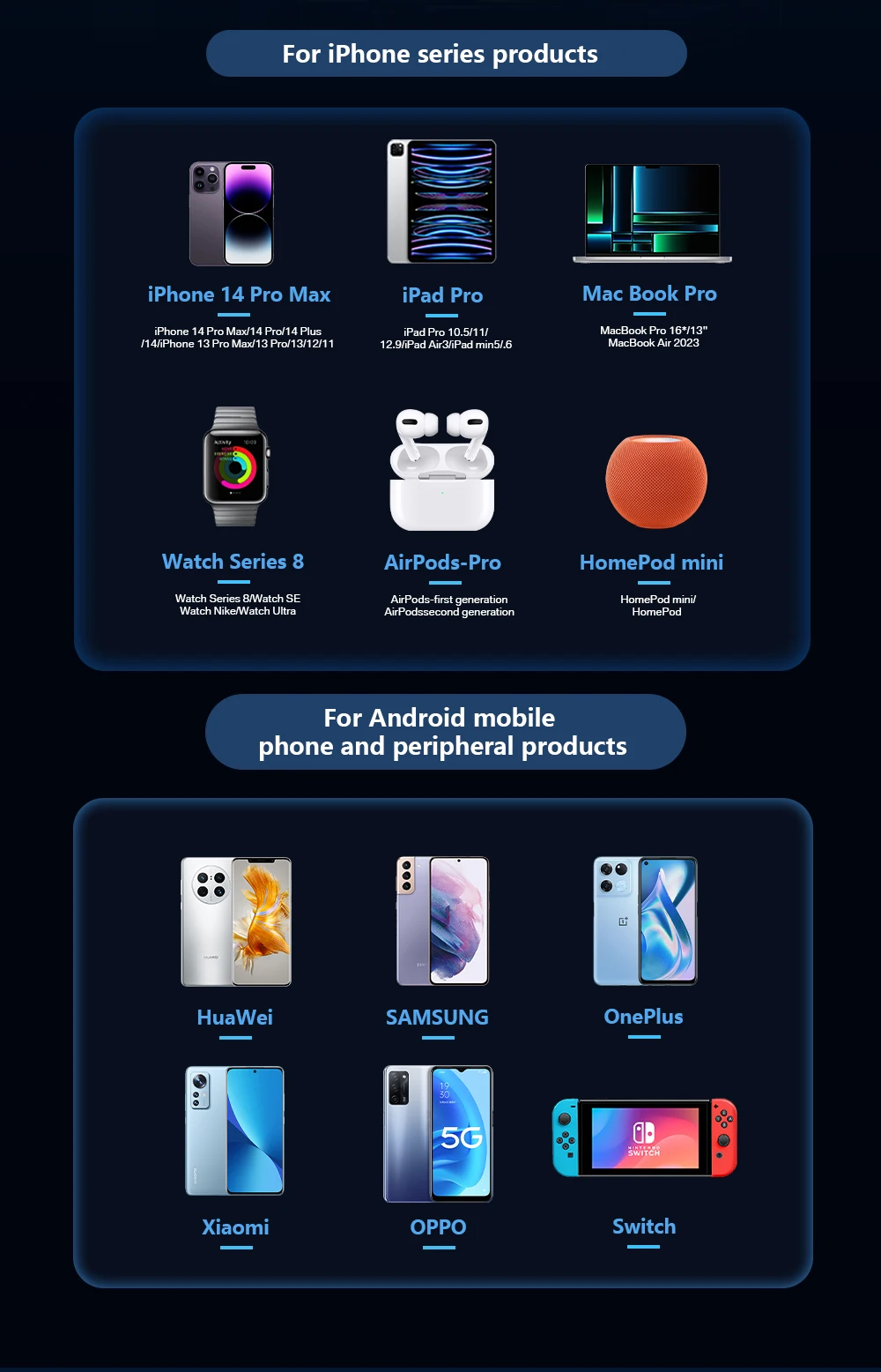 3) La capacidad de carga rápida del cargador está relacionada con el modelo y la versión de software del dispositivo. Las actualizaciones de software del dispositivo pueden afectar la compatibilidad de la carga rápida del cargador. En el uso real, el producto será realmente compatible con más modelos, ya que hay demasiados modelos de dispositivos, no podemos dar ejemplos uno por uno, si tiene preguntas, por favor, póngase en contacto con nosotros, seremos los primeros en responder por usted.