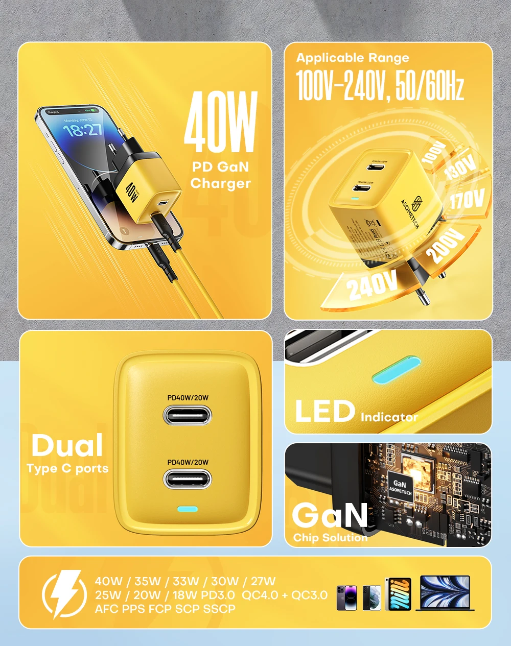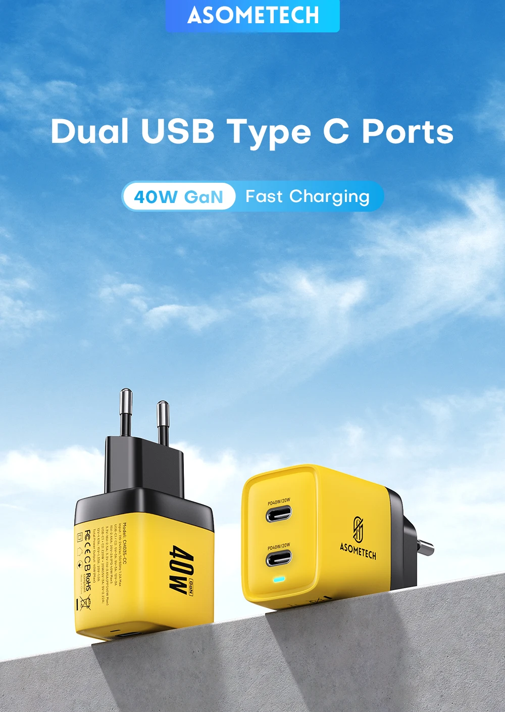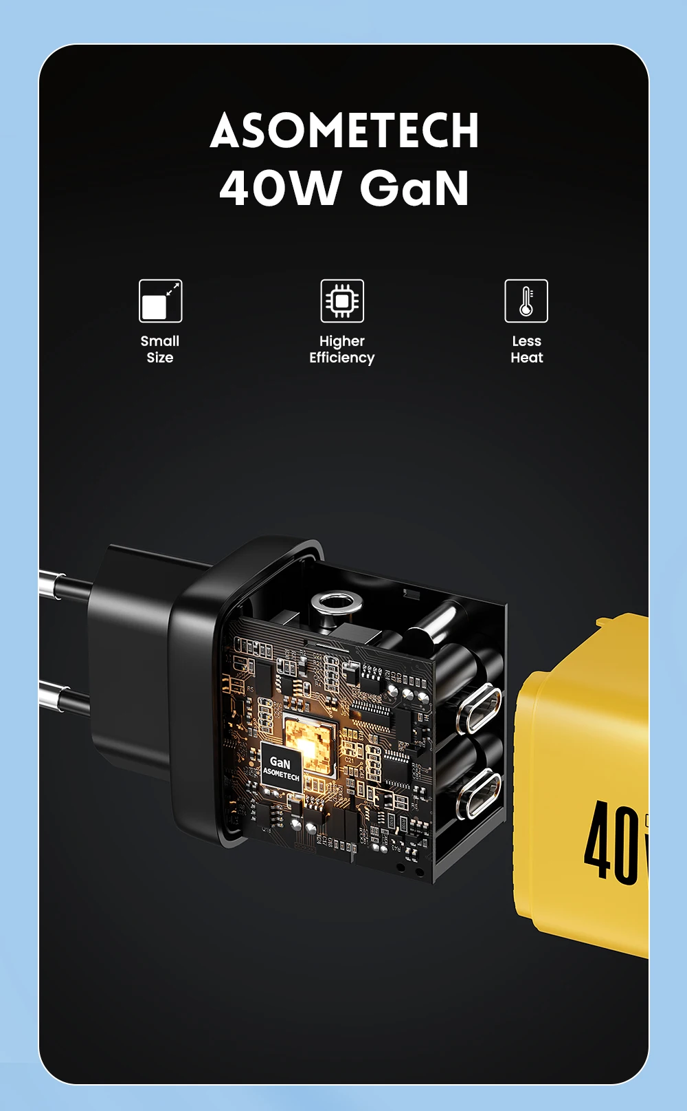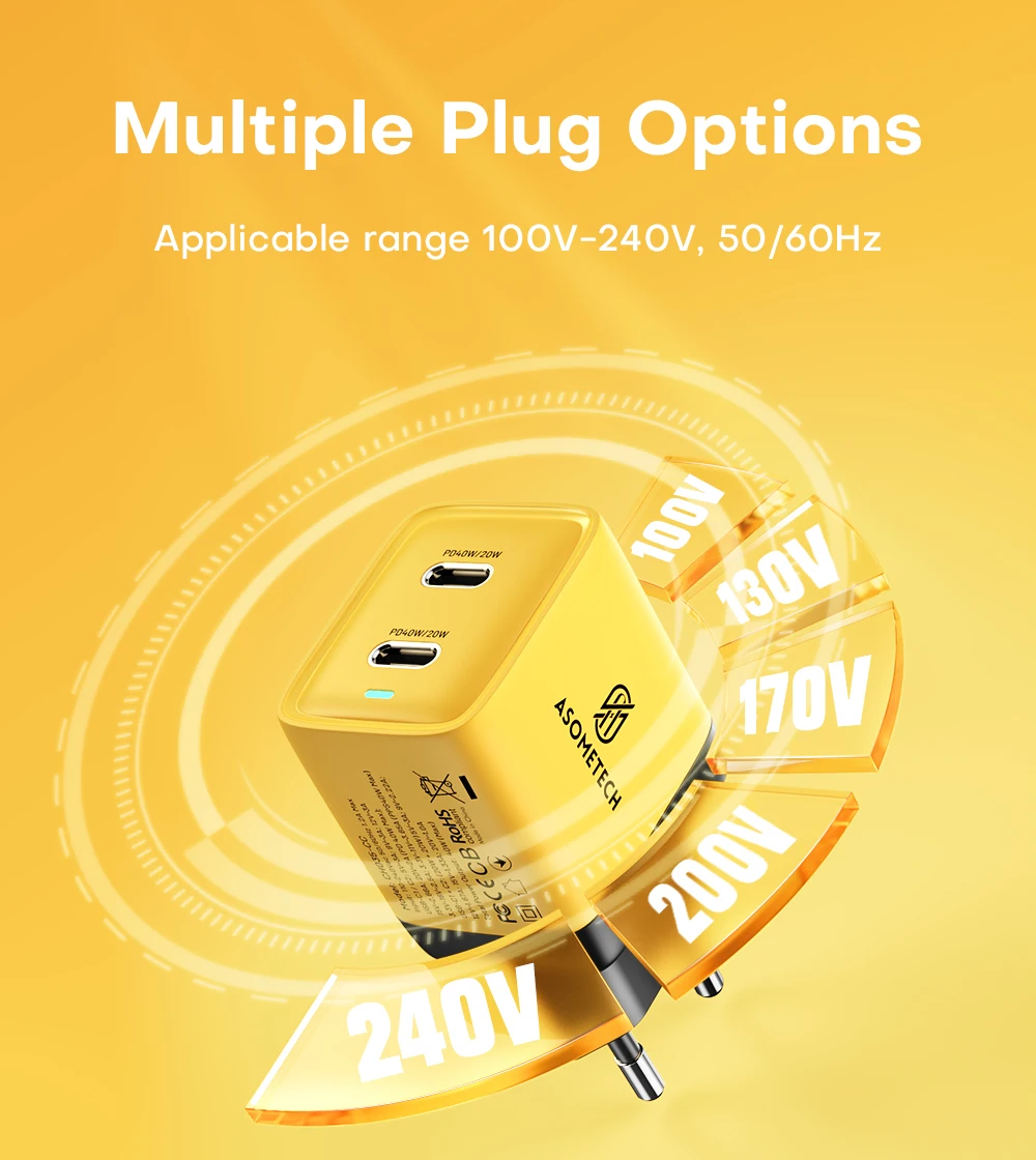Comprar ASOMETECH-cargador GaN de 40W, USB Dual tipo C, Cargador rápido QC4.0 PPS PD, cargador de teléfono portátil para iPhone 16, Samsung S23, iPad y tableta