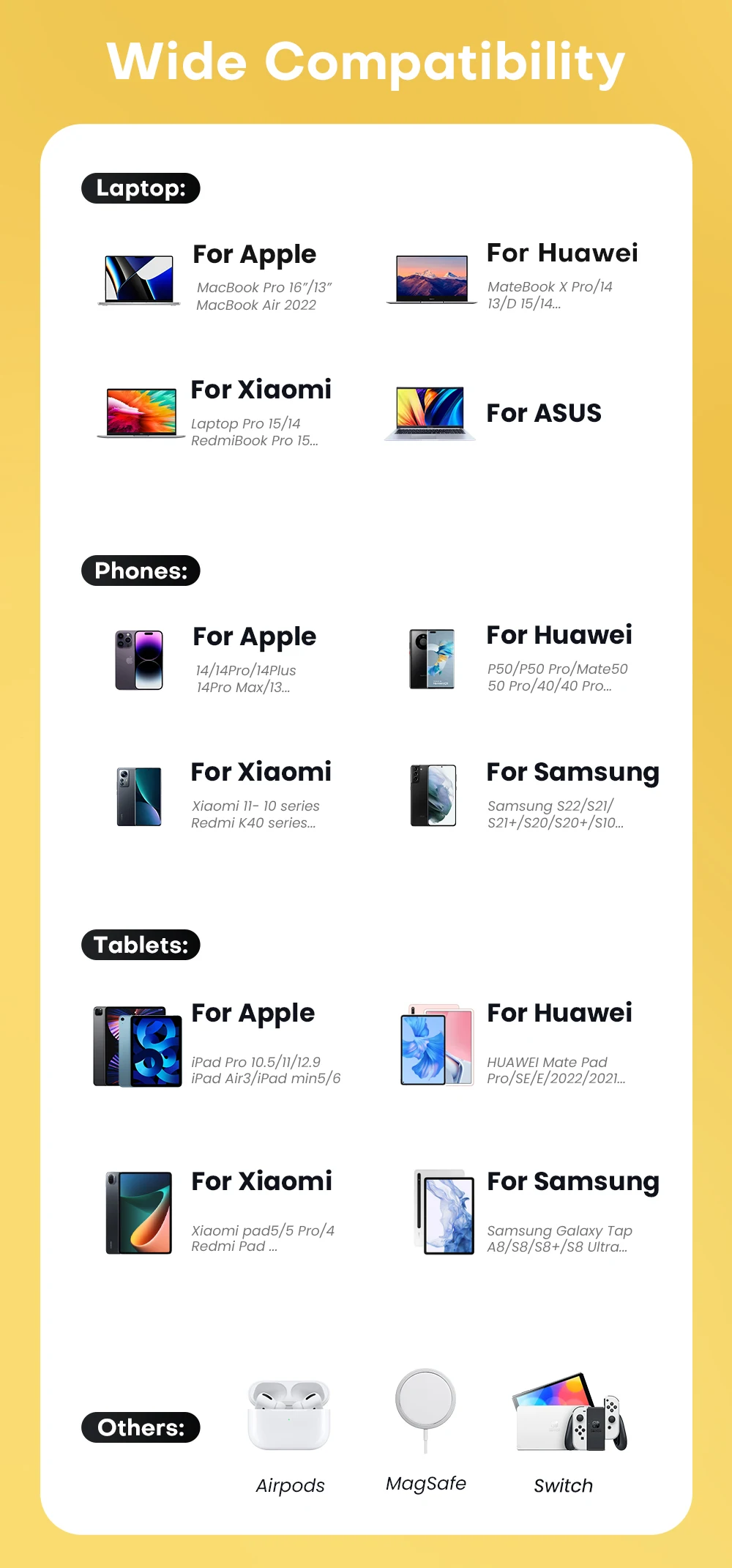 La capacidad de carga rápida del cargador está relacionada con el modelo y la versión de software del dispositivo. Las actualizaciones de software del dispositivo pueden afectar la compatibilidad de la carga rápida del cargador. En el uso real, el producto será realmente compatible con más modelos, ya que hay demasiados modelos de dispositivos, no podemos dar ejemplos uno por uno, si tiene preguntas, por favor, póngase en contacto con nosotros, seremos los primeros en responder por usted.