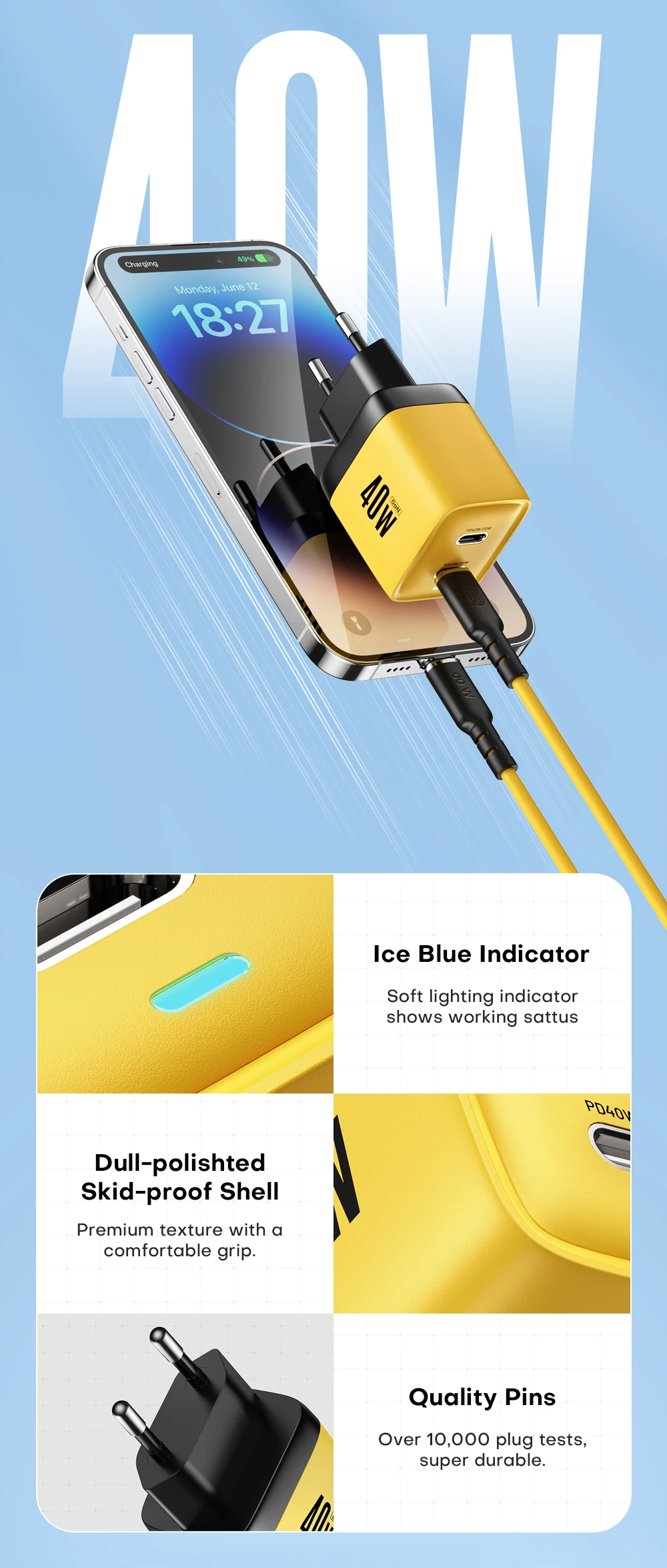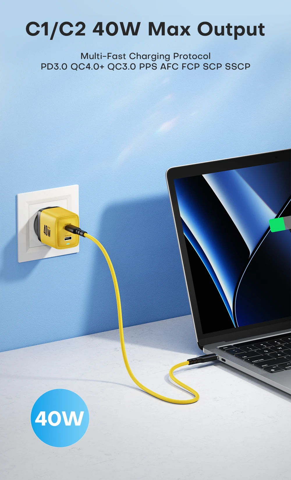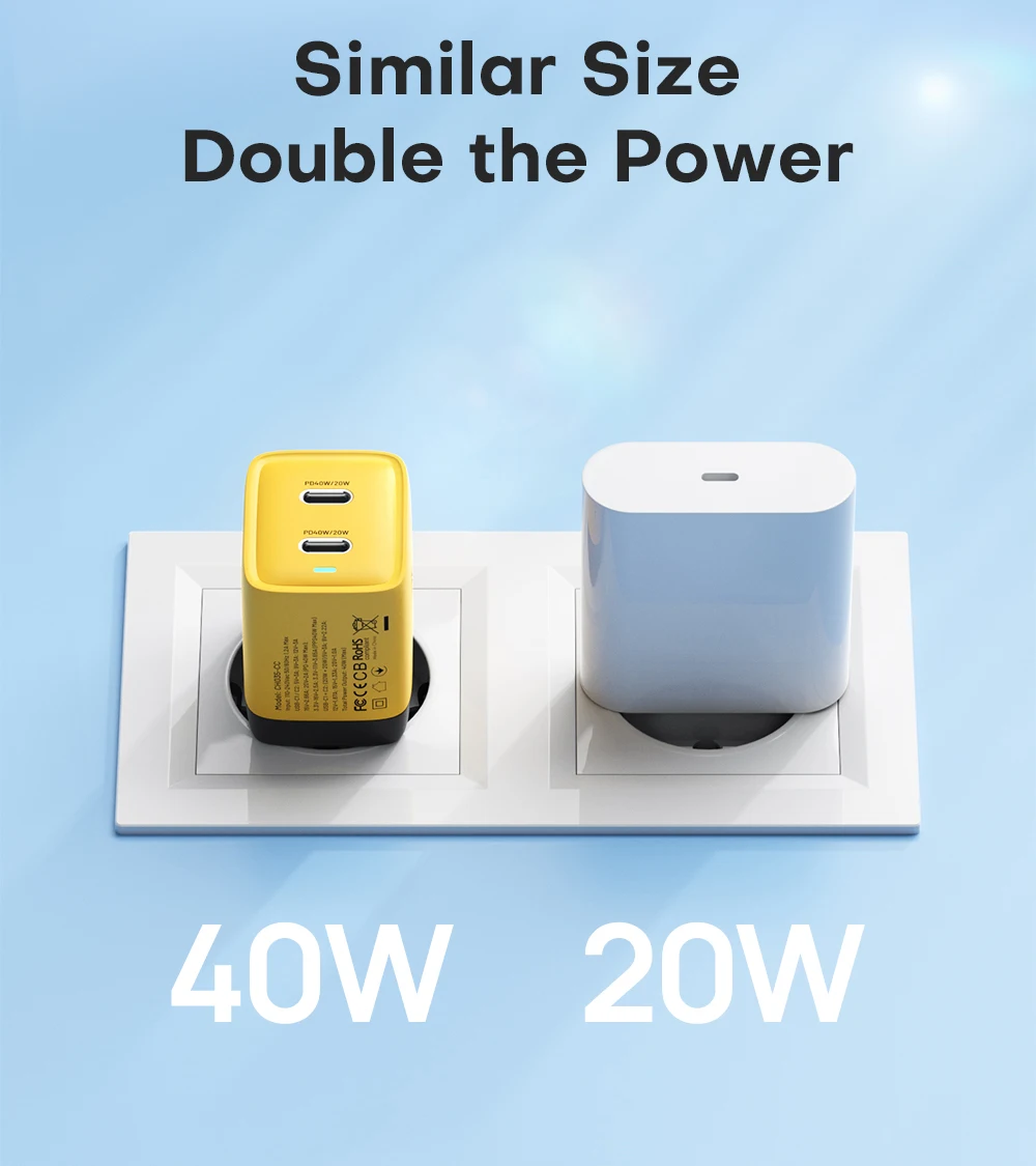 • Salida de alta potencia:Con una potencia de salida máxima de 40W, este cargador puede manejar incluso los dispositivos más hambrientos de energía como MacBook Pro.
