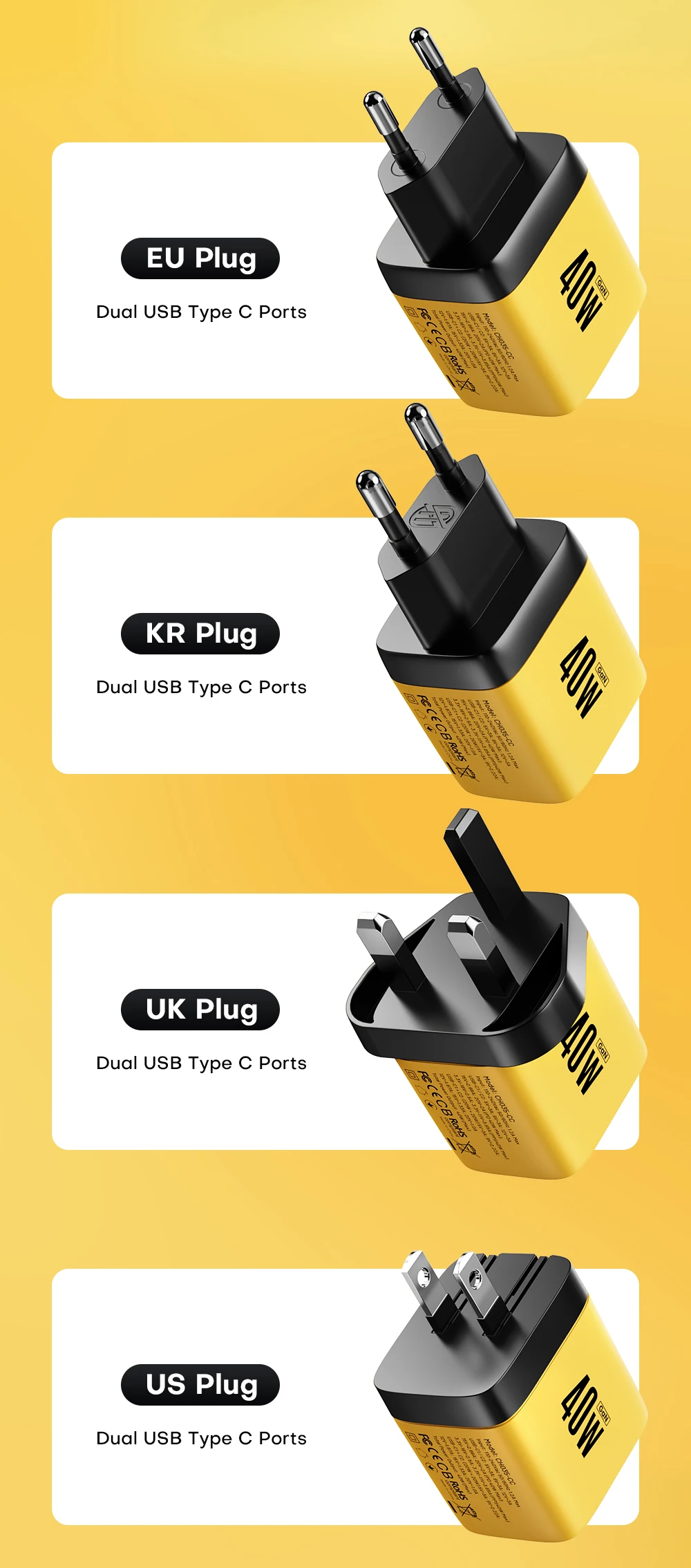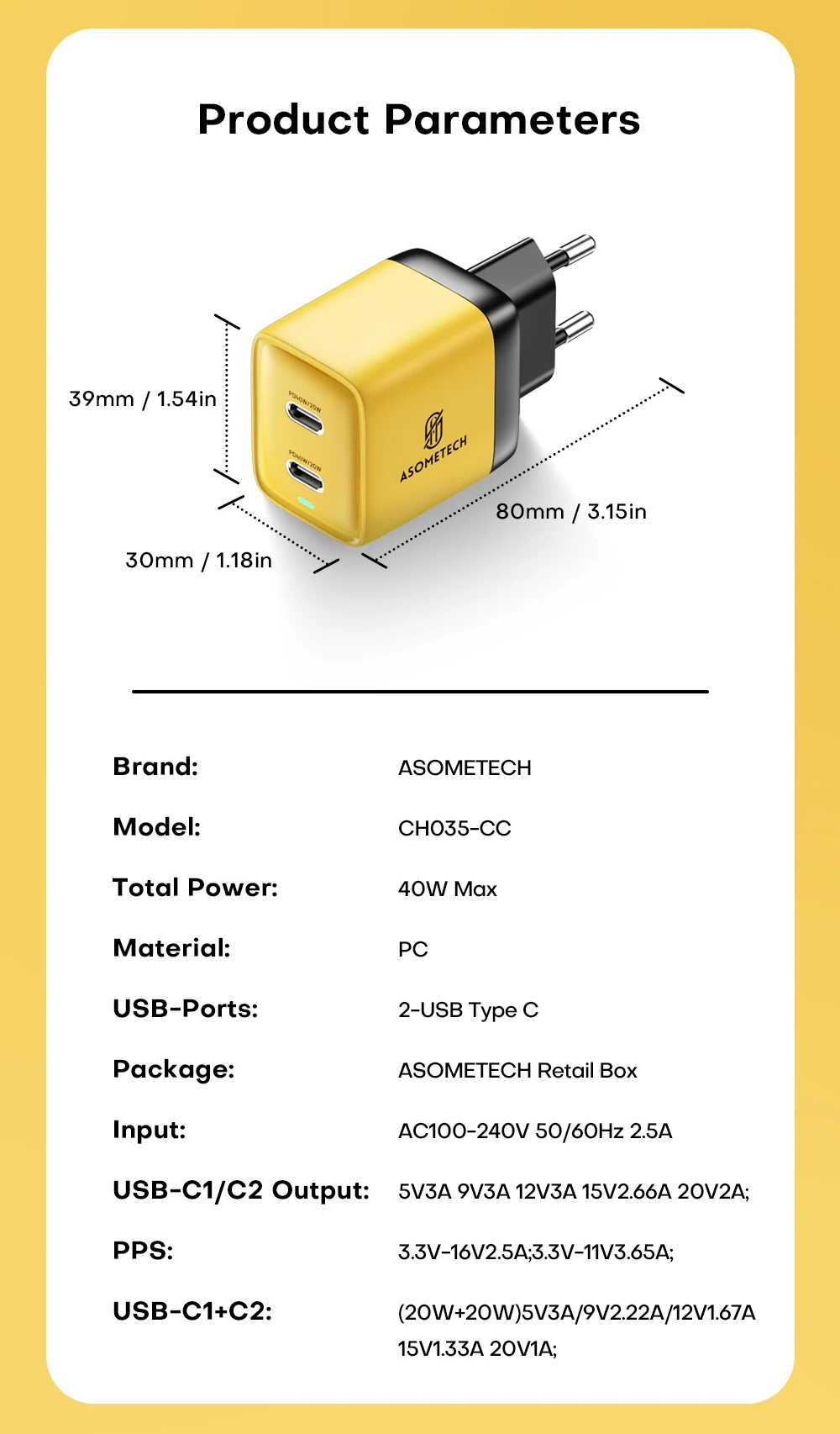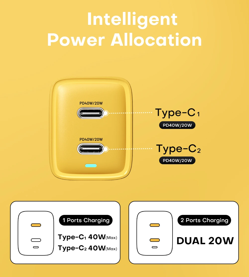 ⚡USB-C1 + C2:(20W + 20W) 5V3A / 9V2.22A / 12V1.67A / 15V1.33A / 20V1A;