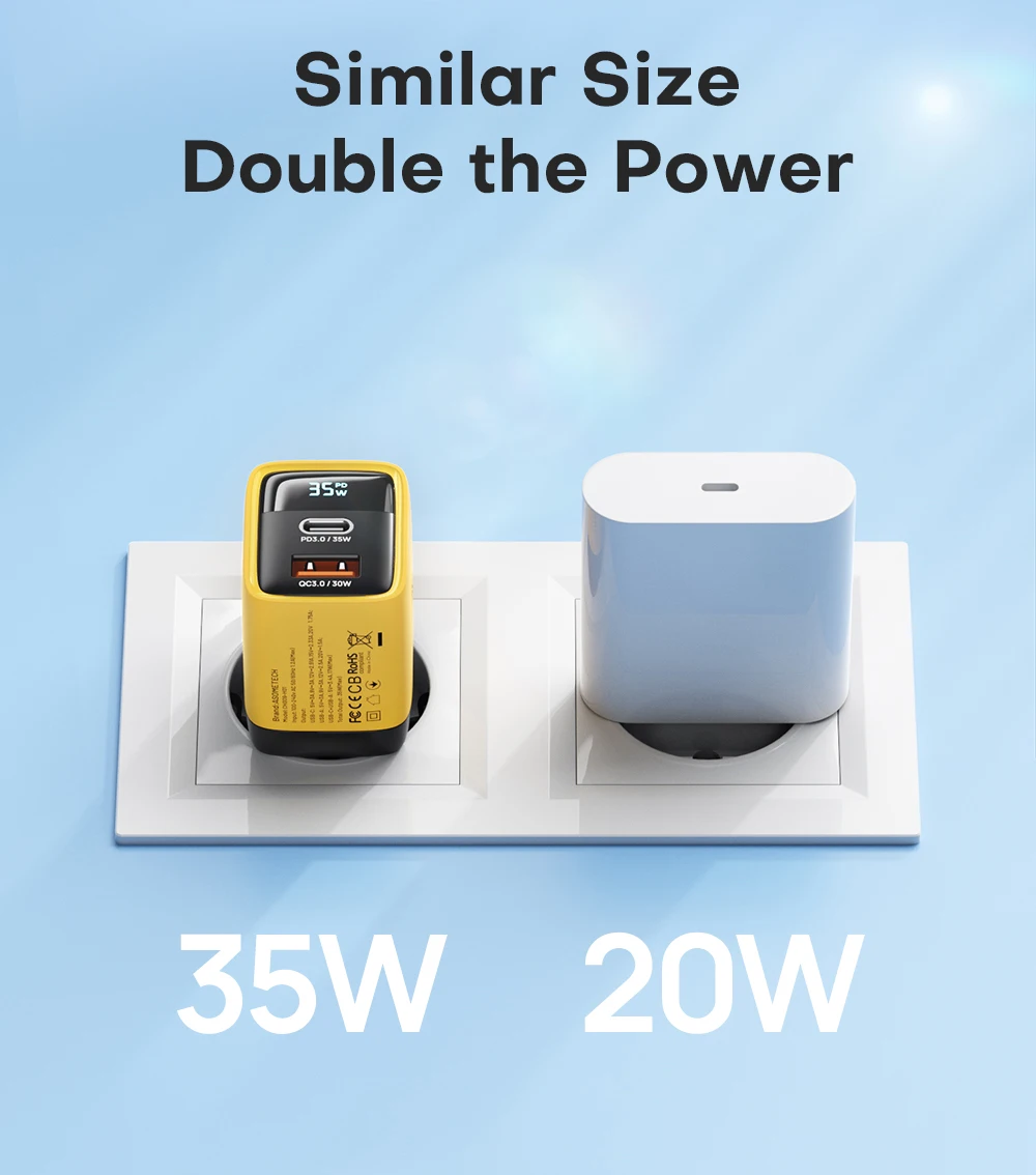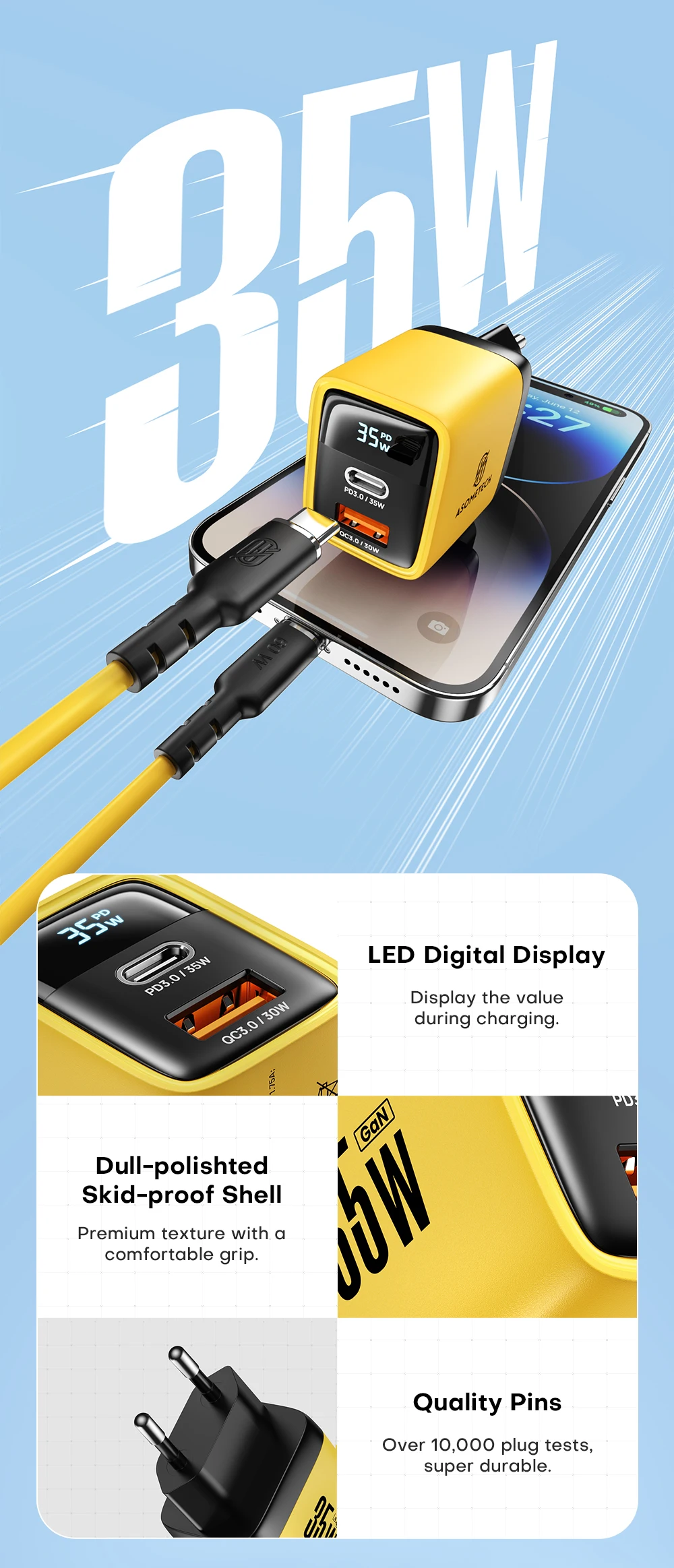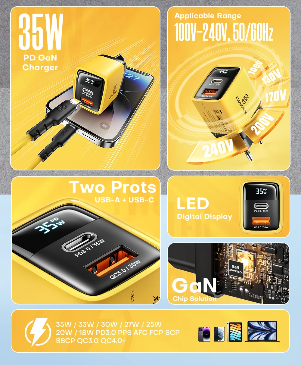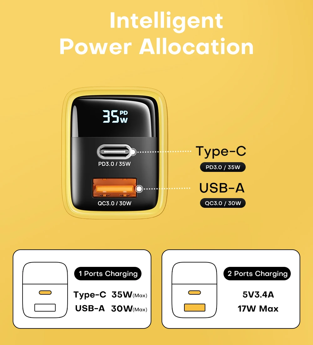 💪【 Carga rápida de 35W Max GaN 】: Puerto C solo admite carga rápida PD de hasta 35W y carga rápida PPS de 33W, y el puerto A solo admite carga rápida QC3.0 de hasta 30W