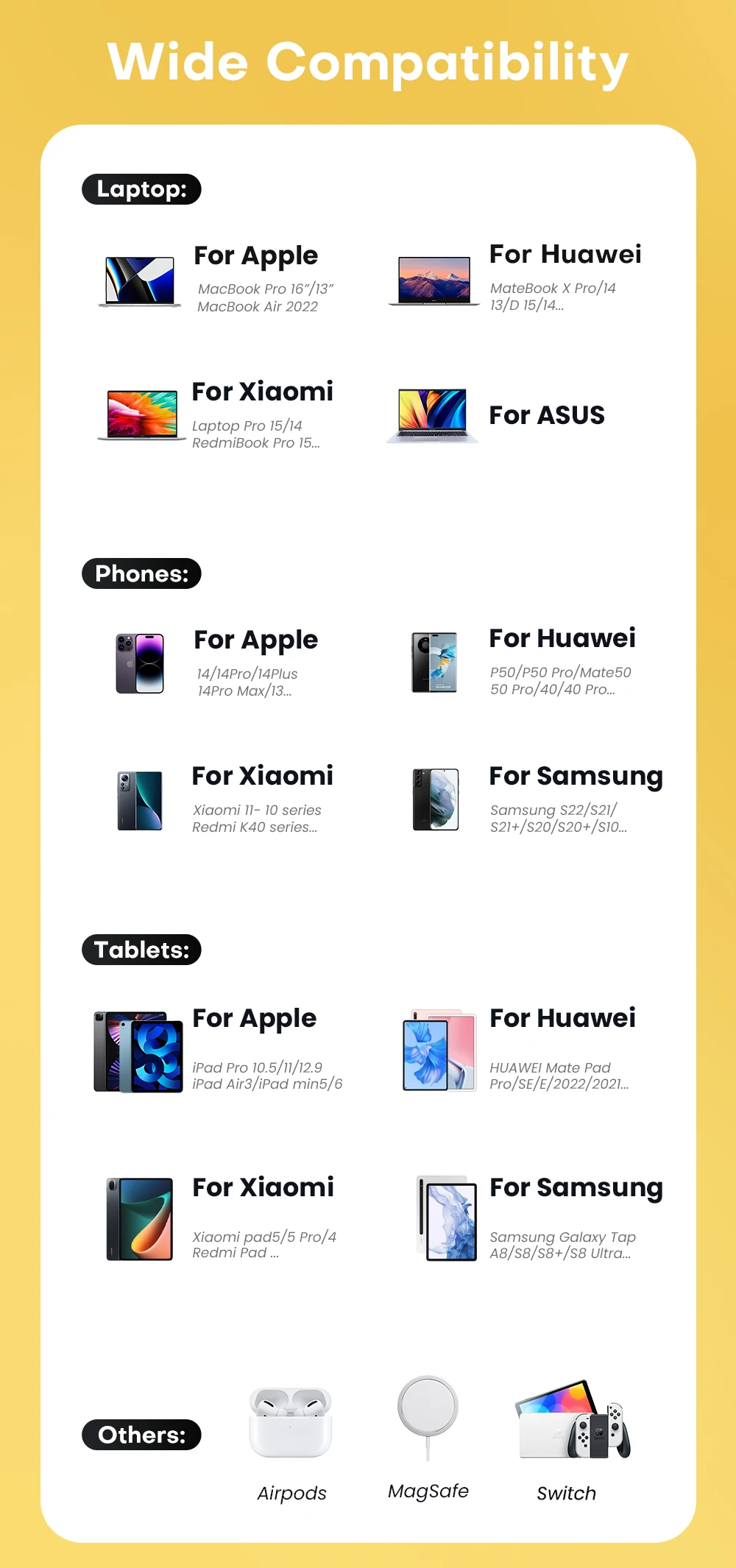 La capacidad de carga rápida del cargador está relacionada con el modelo y la versión de software del dispositivo. Las actualizaciones de software del dispositivo pueden afectar la compatibilidad de la carga rápida del cargador. En el uso real, el producto será realmente compatible con más modelos, ya que hay demasiados modelos de dispositivos, no podemos dar ejemplos uno por uno, si tiene preguntas, por favor, póngase en contacto con nosotros, seremos los primeros en responder por usted.