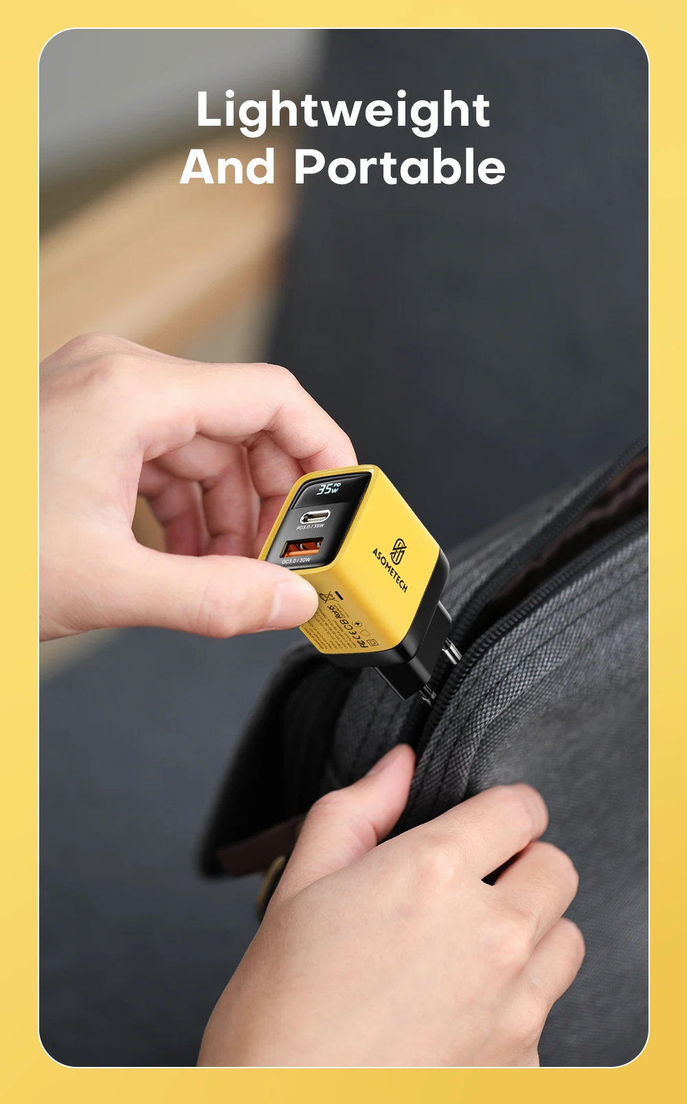 💪【Indicador LED + pantalla digital】: Cargador ASOMTECH 35W con indicador LED de columna y pantalla digital LCD, puede ver el valor de potencia de salida real al cargar.