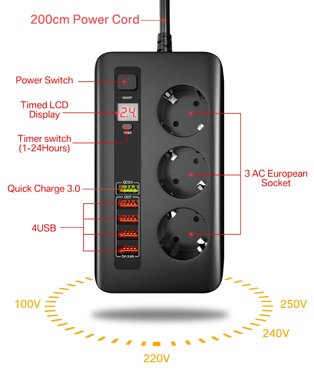 Qc3.0 Versión de carga rápida: 1 x qc3.0 USB-A (5v3a 9v2a 5v1.5a) + 4 x USB-A (5v1a-5v2a)