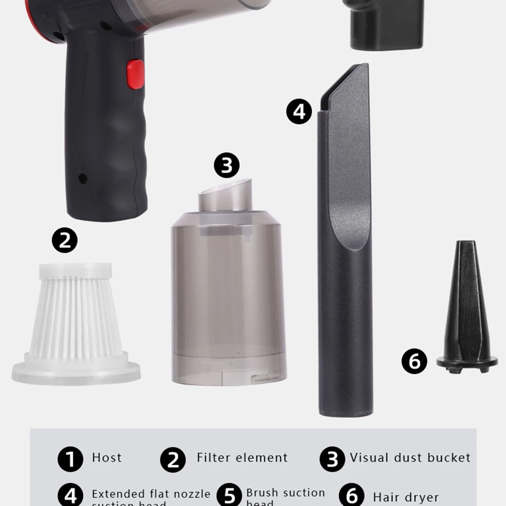 Modelo de carga 4: 1 * Punta de boquilla larga + 1 * Punta de cepillo + 1 * Cable cargador + 1 * secador de pelo + 1 * bolsa de almacenamiento + 3 * elementos de filtro (16000Pa)