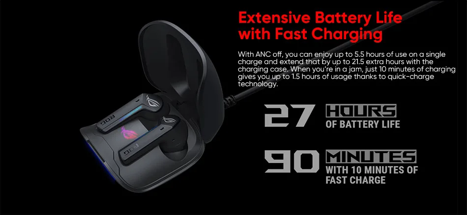 Con ANC apagado, hasta 5,5 horas de uso con una sola carga y se extienden hasta 21,5 horas adicionales con el estuche de carga, y admite carga rápida. Por ejemplo, solo 10 minutos de carga le dan hasta 1,5 horas de uso cuando está en un aprieto.