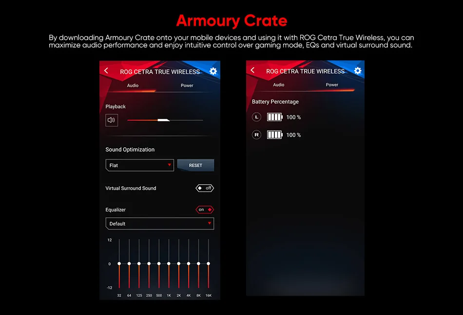 Al descargar Armory Crate en los dispositivos móviles y usarlo con ROG Cetra True Wireless, el rendimiento del audio se maximiza y los usuarios pueden disfrutar de un control intuitivo sobre el modo de juego, ecualizadores y sonido envolvente virtual.