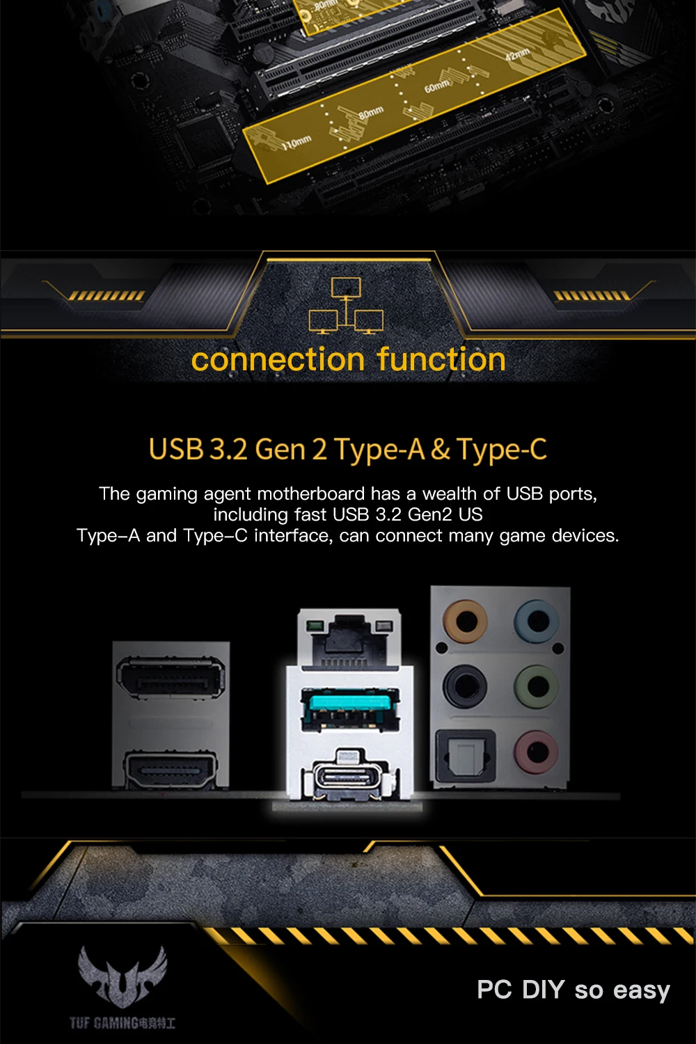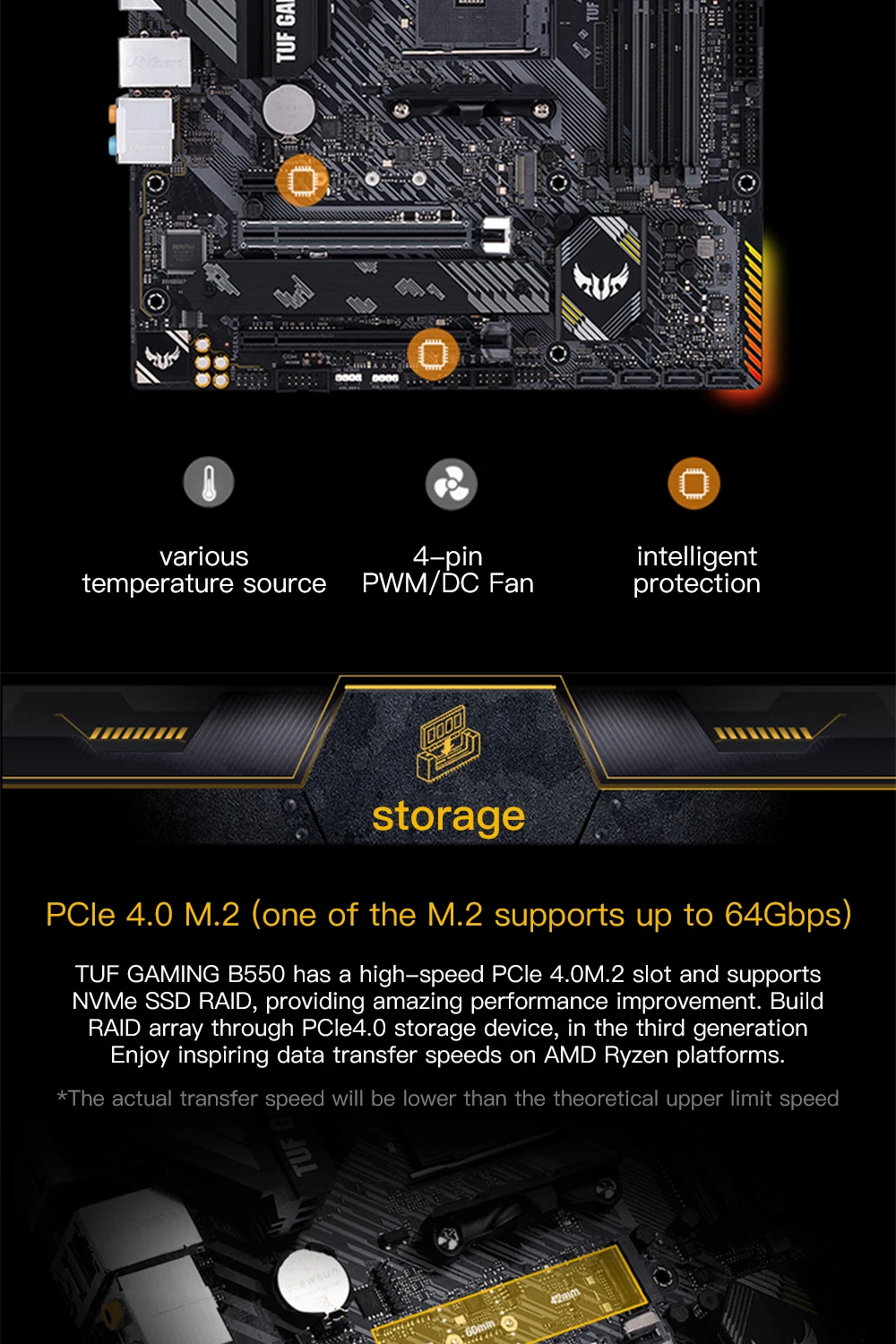 Pcle 4,0 M 2 (uno de los M 2 admite hasta 64Gbps) TUF GAMING B550 tiene un Pcle 4 de alta velocidad. 0M. 2 ranuras y soporta NVME SSD RAID, proporcionando una increíble mejora de rendimiento. BuildRAID array a través del dispositivo de almacenamiento Pcle4 0, en la tercera generación Disfrute de inspiradoras velocidades de transferencia de datos en las plataformas AMD Ryzen * La velocidad de transferencia real será inferior a la velocidad límite superior teórica