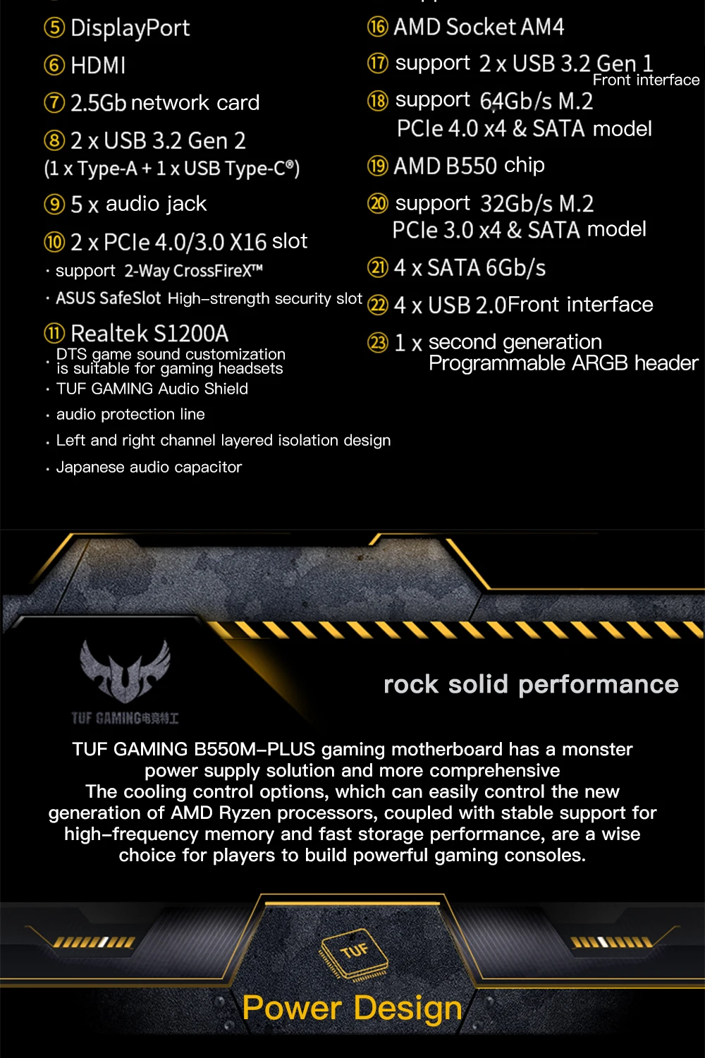 La placa base para juegos TUF GAMING tiene una solución de suministro de energía Monster y más completa. Las opciones de control de enfriamiento, que pueden controlar fácilmente la nueva generación de procesadores AMD Ryzen, junto con un soporte estable para memoria de alta frecuencia y un rápido rendimiento de almacenamiento, son una buena elección para que los jugadores construyan potentes consolas de juegos