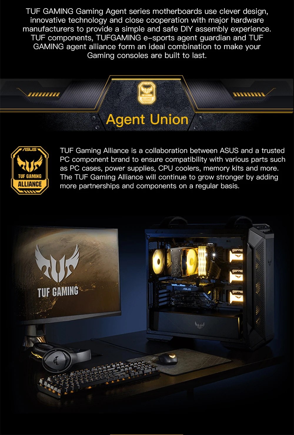 TUF Gaming Alliance es una colaboración entre ASUS y una marca de componentes de PC de confianza para garantizar la compatibilidad con varias partes, como carcasas de PC, fuentes de alimentación, enfriadores de CPU, kits de memoria y más. TUF Gaming Alliance seguirá fortaleciéndose añadiendo más asociaciones y componentes de forma regular.