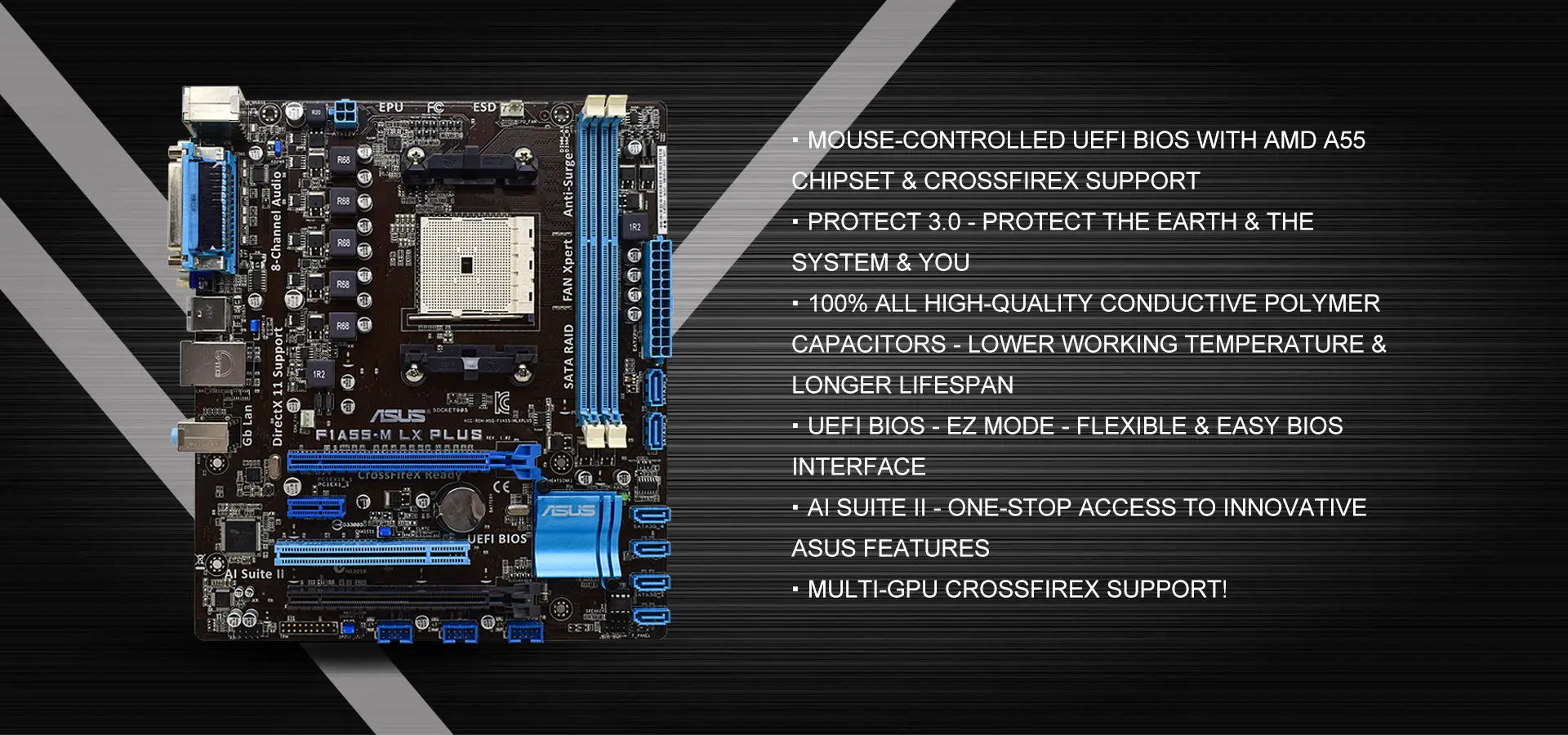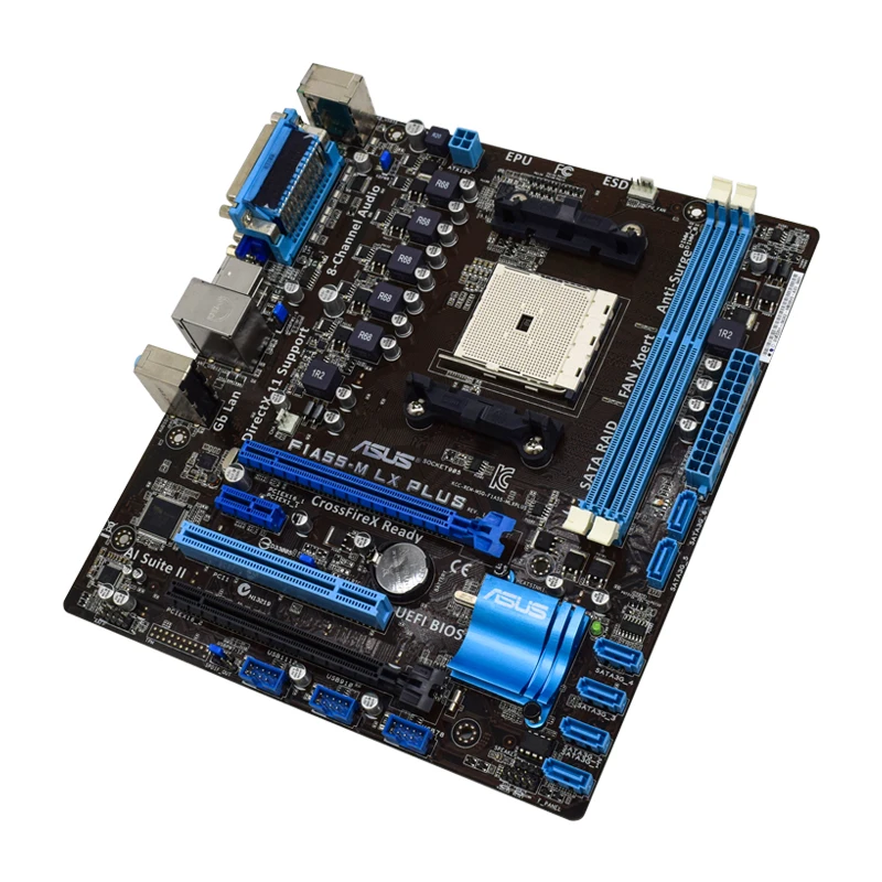 Chip de la placa baseTarjeta de sonido/tarjeta de red con chip integradoConjunto de chips principal AMD A55Descripción del chipset Utilizando el chipset AMD A55 FCH (Hudson D2)Chip de visualización Chip de visualización incorporado de CPU (requiere soporte de CPU)Chip de audio integrado Realtek ALC887 chip de audio de 8 canalesChip de tarjeta de red Tarjeta de red Gigabit Realtek RTL8111E integradaEspecificaciones del procesadorTipo de CPU AMD A/E2Zócalo de CPU FM1Especificaciones de memoriaTipo de memoria 2×DDR3 DIMMCapacidad máxima de memoria 32 GBDescripción de la memoria Admite memoria DDR3 2250 de doble canal (overclocking)/1866/1600/1333/1066MHzAmpliación de almacenamientoRanura PCI-E 2 × ranura gráfica PCI-E X16, 1 × ranura PCI-E X1Ranura PCI 1 × ranura PCIInterfaz de almacenamiento Interfaz 6×SATA IIInterfaz de E/SInterfaz USB 12×interfaz USB2.0 (6 +6 backplane integrados)Interfaz de vídeo 1 × interfaz VGAConector de alimentación Un conector de alimentación de 4 pines y un de 24 pinesOtras interfaces 1 × interfaz de red RJ45, interfaz de audio, interfaz universal de teclado y mouse PS/2Tipo de placaPlaca base tipo placa uATXDimensiones 24,4×21.3cmGestión de softwareRendimiento del BIOS ROM Flash de 32 Mb, BIOS UEFI, PnP, DMI v2.0, WfM2.0, SM BIOS V2.6, ACPI V2.0aOtros parámetrosModo de alimentación 4+1 fasesFunción RAID compatible con RAID 0, 1, 10Otras características compatibles con la tecnología Turbo Boost2.0
