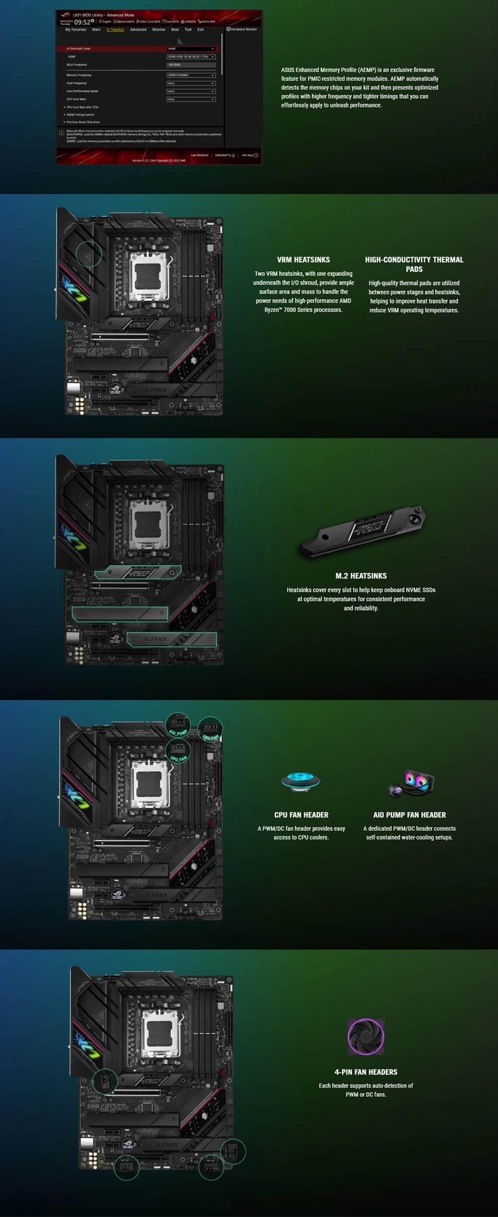Diseño térmico optimizado: disipadores térmicos masivos VRM con canales de flujo de aire estratégicamente cortados y almohadillas térmicas de alta conductividad.