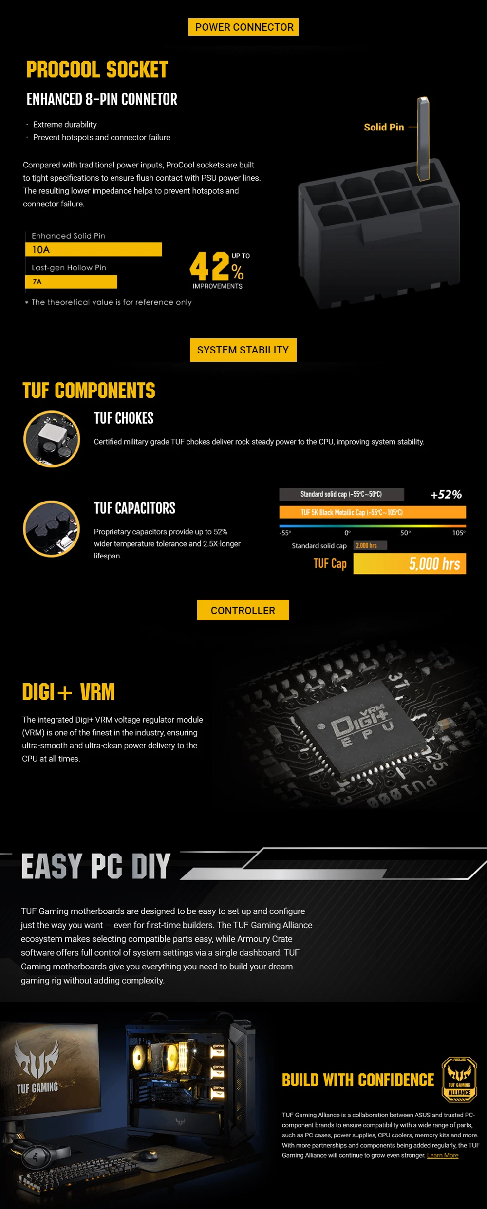 Robust Power Design: 8+2 DrMOS power stages with high-quality alloy chokes and durable capacitors to provide reliable power for the last AMD high-count-core CPUs