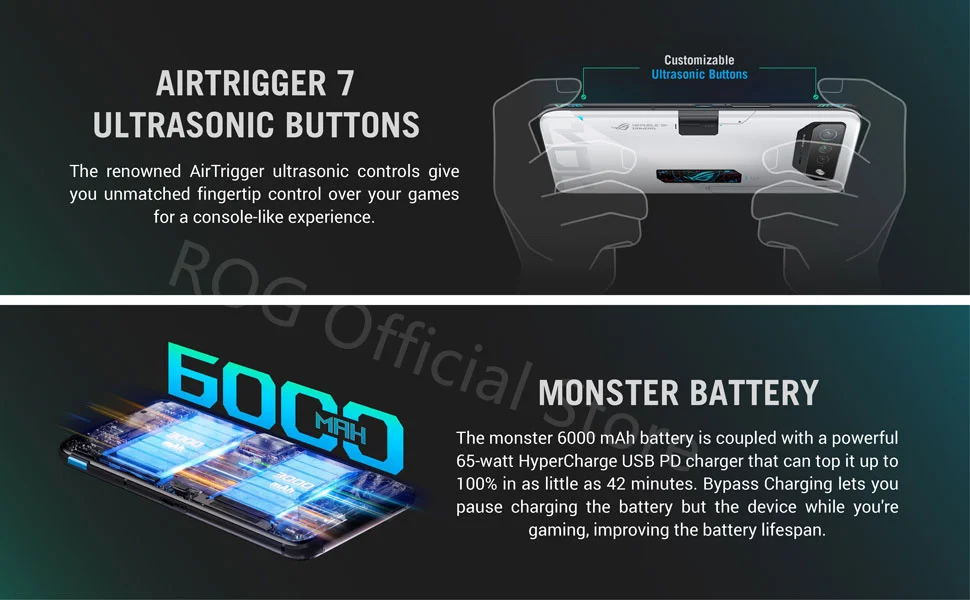 Los reconocidos controles ultrasónicos AirTrigger le brindan un control inigualable de la punta de los dedos sobre sus juegos para una experiencia similar a la de la consola. Son compatibles con una amplia gama de gestos, incluyendo acción dual, presionar y levantar, y apuntar con giroscopio. ¡Tome el control total con el ROG 7 Ultimate!