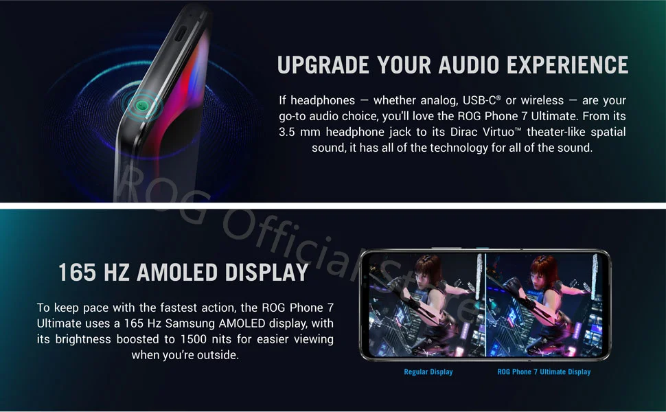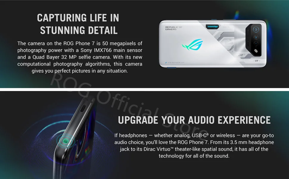 Si los auriculares, Ya sean analógicos, de audio o inalámbricos, son su opción de audio, le encantarán los ROG 7. Desde su conector para auriculares de 3,5mm hasta su Dirac Virtuo™Sonido espacial similar al de un teatro, tiene toda la tecnología para todo el sonido. Qualcomm® aptX™Y el soporte aptX Lossless garantiza un audio Bluetooth de alta fidelidad de latencia superbaja, por lo que sea cual sea su elección auditiva, sus oídos le agradecerán el ROG 7.