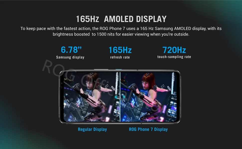 Para seguir el ritmo de la acción más rápida, el ROG 7 utiliza una pantalla Samsung AMOLED de 165Hz con una frecuencia de muestreo táctil de 720Hz y una precisión de color Delta-E 1 para obtener imágenes excelentes. También hemos aumentado el brillo a 1.500 NITs para facilitar la visualización cuando estás fuera.