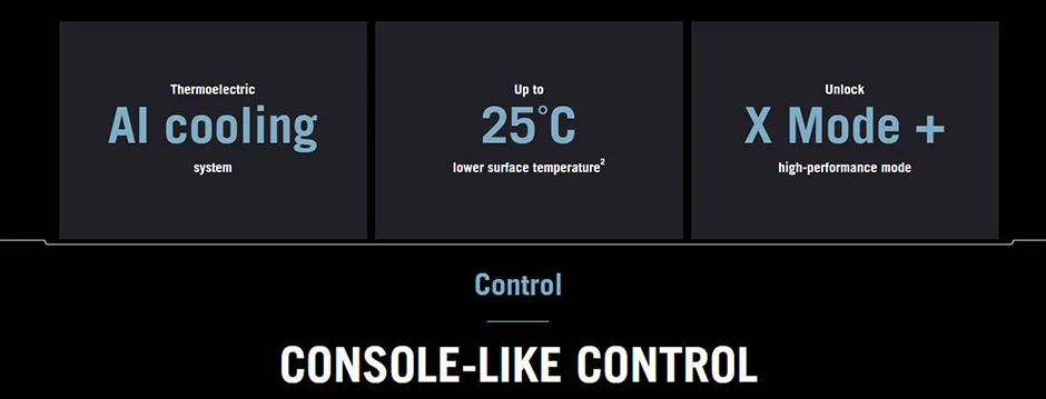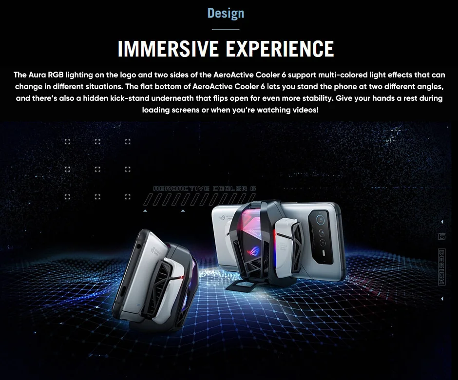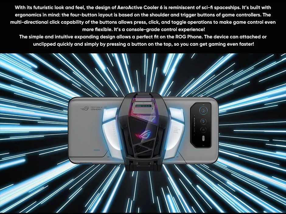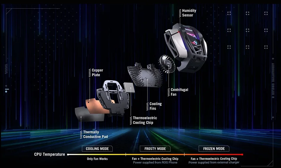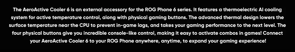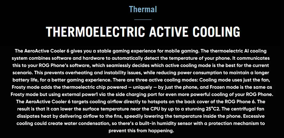Hay tres modos de enfriamiento activo: el modo de enfriamiento utiliza solo el ventilador, el modo Frosty agrega el chip termoeléctrico alimentado-de forma única solo por el teléfono, Y el modo congelado es el mismo modo asFrosty pero usa la potencia externa 1 a través del puerto de carga lateral para un enfriamiento aún más potente de su teléfono ROG. El enfriador aeroactivo 6 se centra en la refrigeración Flujo de aire directamente a los puntos calientes de la cubierta trasera del teléfono ROG 6. Así es que puede reducir la temperatura de la superficie cerca de la CPU hasta en unos impresionantes 25 ℃ 2.