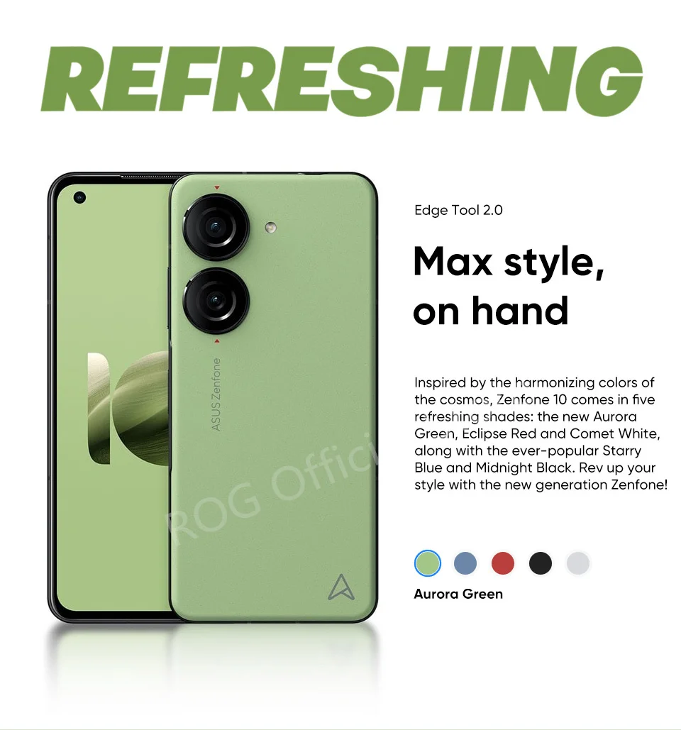 Inspirado en los colores armonizadores del cosmos, ZenFone 10 viene en cinco tonos refrescantes: el nuevo Aurora Green, Eclipse Red y Comet White, junto con el siempre popular Starry Blue y Midnight Black. ¡Mejora tu estilo con la nueva generación de ZenFone!