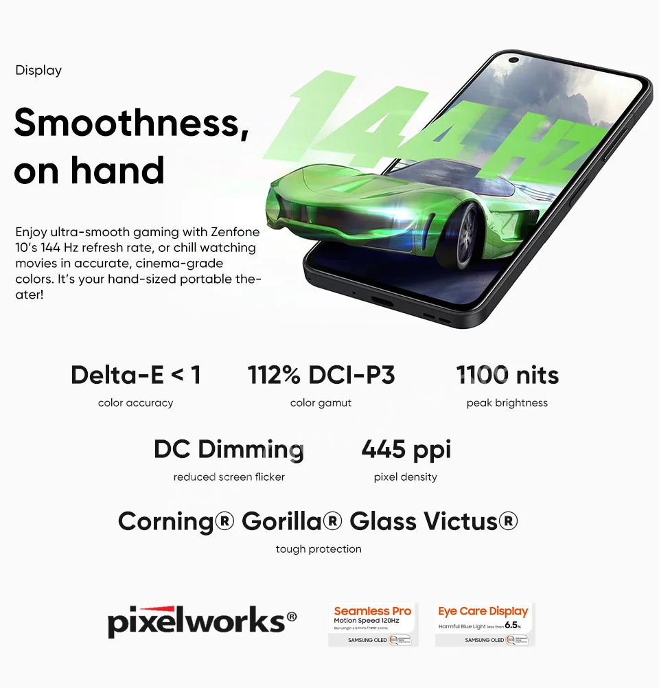 Disfrute de juegos ultrasuaves con la frecuencia de actualización de 144 Hz7 de ZenFone 10, o relájese viendo películas en colores precisos y de calidad cinematográfica. ¡Es tu teatro portátil del tamaño de una mano!