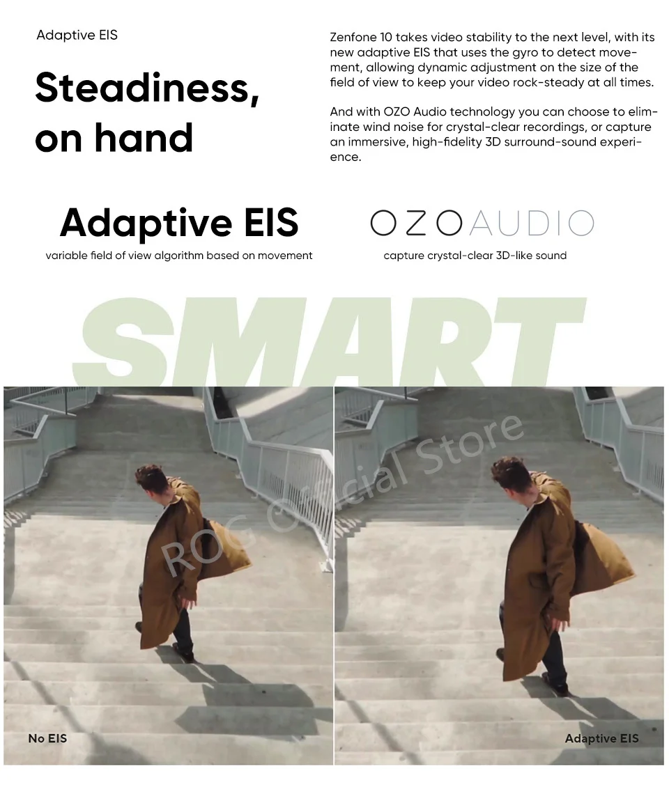 ZenFone 10 lleva la estabilidad del video al siguiente nivel, con su nuevo EIS adaptativo que utiliza el giroscopio para detectar movimiento, permite un ajuste dinámico en el tamaño del campo de visión para mantener su video estable en todo momento. Y con la tecnología de audio OZO puede elegir eliminar el ruido del viento para grabaciones nítidas, O captura un sonido envolvente 3D inmersivo y de alta fidelidad