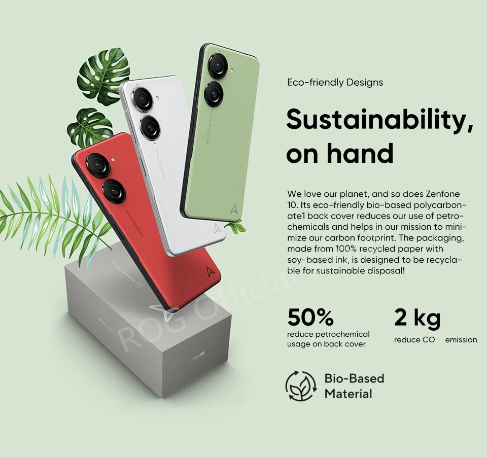 Amamos nuestro planeta, y también ZenFone 10. Su cubierta trasera ecológica de policarbonato de base biológica reduce nuestro uso de productos petroquímicos y ayuda en nuestra misión de minimizar nuestra huella de carbono. ¡El embalaje, hecho de papel reciclado 100% con tinta a base de soja, está diseñado para ser reciclable para su eliminación sostenible!