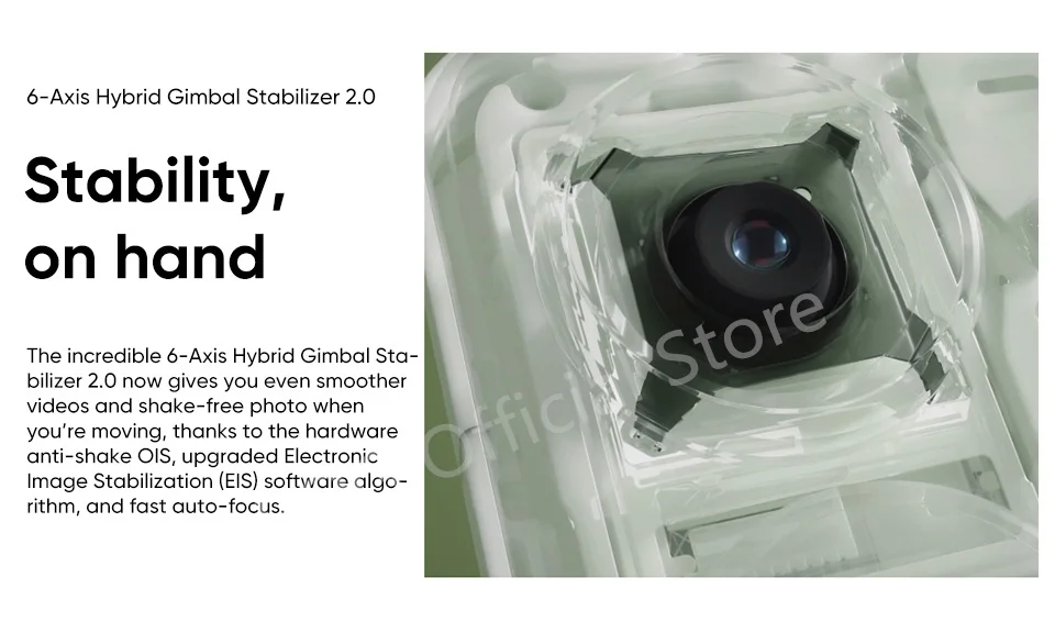 El increíble estabilizador de cardán híbrido de 6 ejes 2,0 ahora le brinda videos aún más suaves y fotos sin movimientos cuando se está moviendo, gracias al hardware antivibración OIS, imagen electrónica mejorada