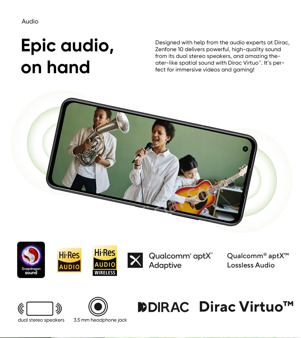 Diseñado con la ayuda de los expertos en audio de Dirac, ZenFone 10 ofrece un sonido potente y de alta calidad desde sus altavoces estéreo duales y un increíble sonido espacial similar al de un teatro con Dirac Virtuo™... ¡Es perfecto para videos y juegos inmersivos!
