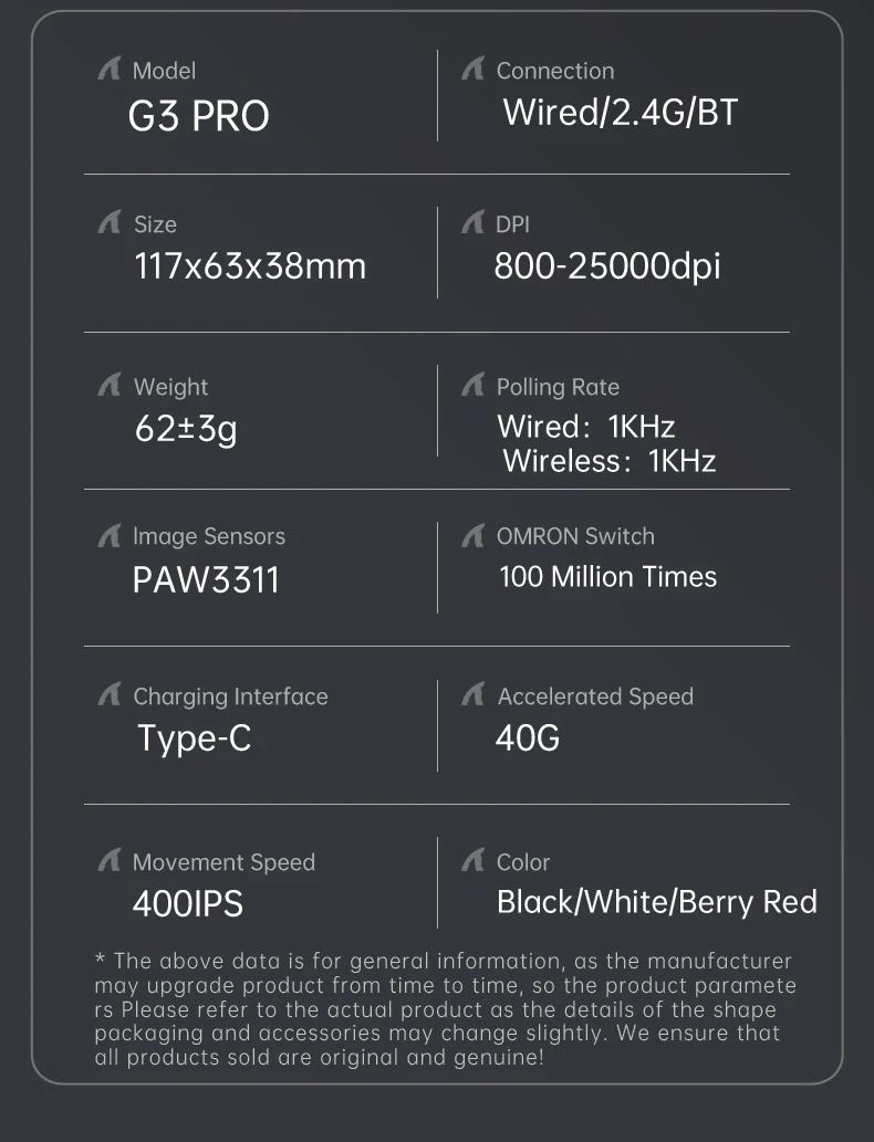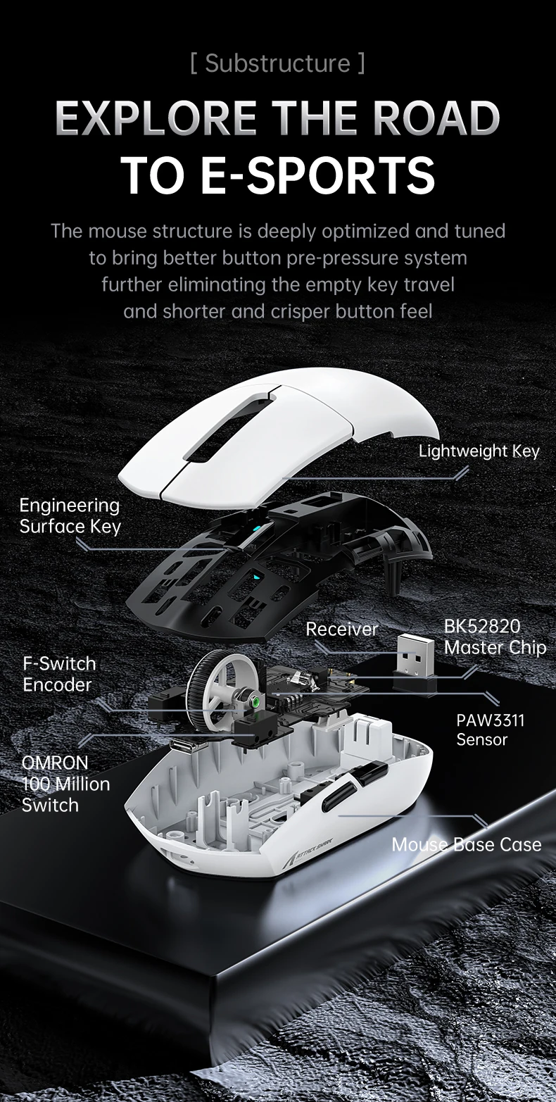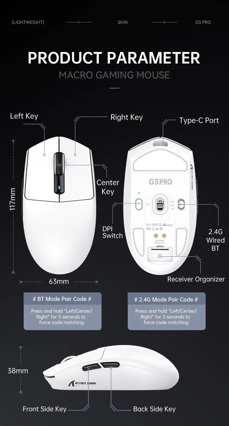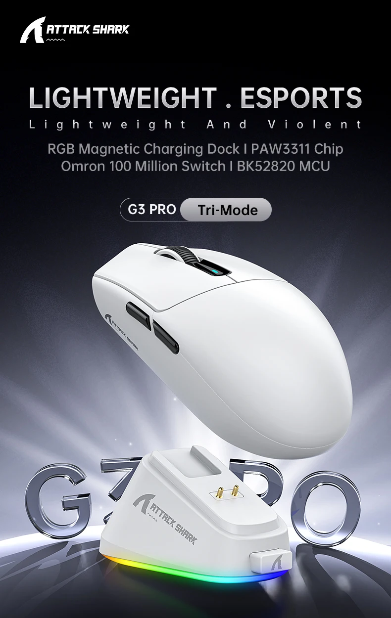Ratón para juegos ligero ATTACK SHARK G3 PRO Base magnética RGB| 62 g ultraligero| Sensor PAW3311| Clics OMRON 100M| Trimodo 2.4G/BT/con cable| Negro/Blanco