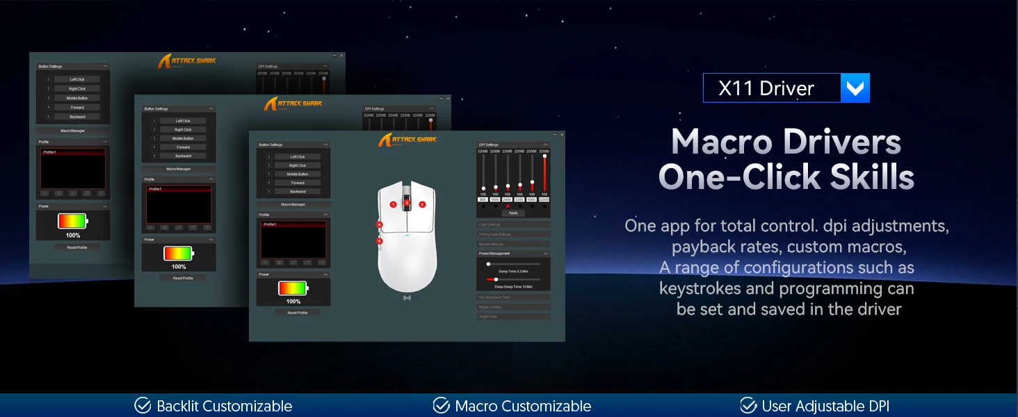 The X11 gaming mouse is equipped with PixArt 3311 flagship sensor with a DPI up to 22,000 and 6 levels of adjustment. Whether you use it for daily work or professional gaming, X11 can easily meet your needs.