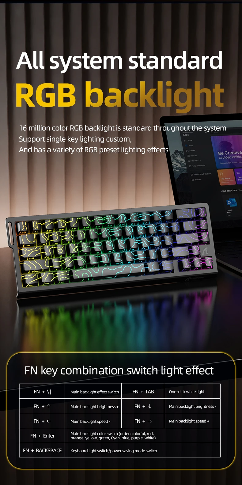 --4.Iluminación RGB fría, la retroiluminación RGB de 16 millones de colores es estándar en todo el sistema. Admite iluminación personalizada de una sola tecla y tiene una variedad de efectos de iluminación preestablecidos RGB.