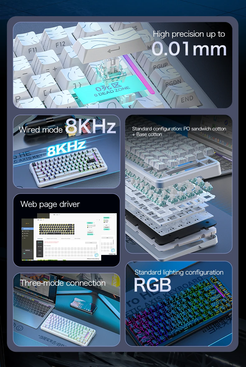 Teclado inalámbrico equipado con interruptores magnéticos Hall totalmente ajustables, este dispositivo permite a los usuarios personalizar puntos de activación de 0,1 a 3,4 mm, ofreciendo precisión y capacidad de respuesta.Ideal para juegos y uso profesional, garantiza un rendimiento suave y confiable y una durabilidad duradera, capaz de soportar millones de clics.