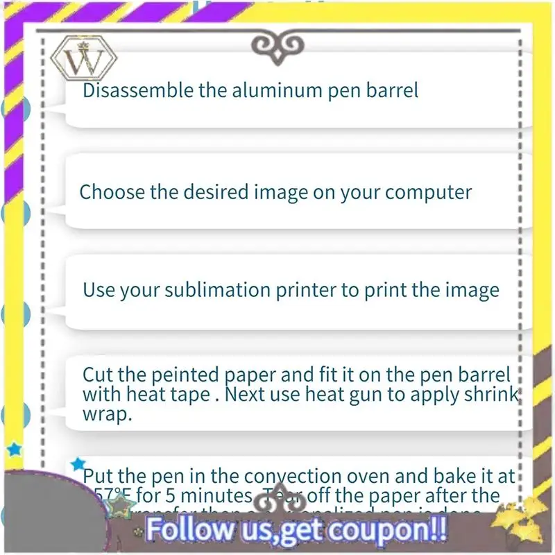 Nuestros bolígrafos en blanco para sublimación de tinta tienen un revestimiento de sublimación de tinta en la superficie, que puede imprimir fácilmente patrones o texto en el cuerpo del bolígrafo, sin dejar casi imperfecciones.TENGA EN CUENTA: Si su bolígrafo toca metal durante el horneado, gírelo hasta la mitad para que la envoltura retráctil no se derrita.