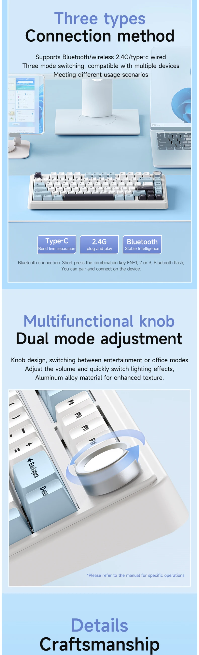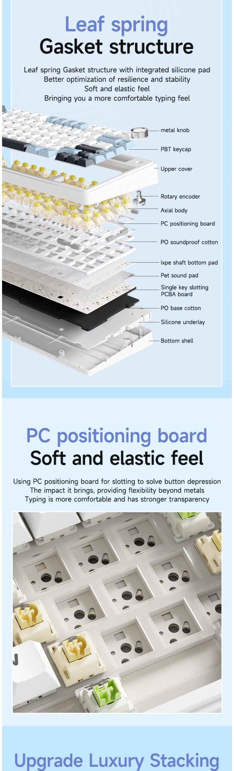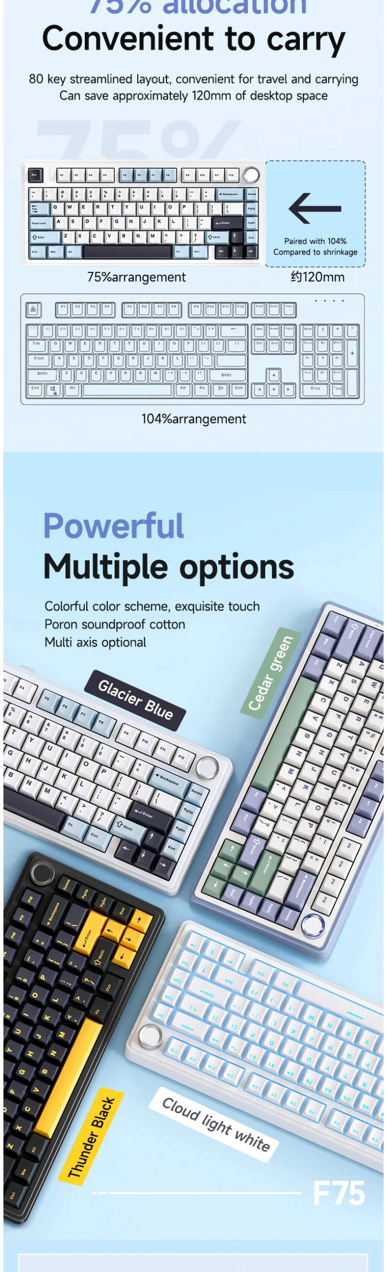 AULA F75 Original OEM RGB personalizado Hot-Swap PBT 75% 80 teclas Bluetooth 5,0/2.4G junta de teclado mecánico de juego inalámbrico/por cableEspecificaciónartículovalorTeclado de tamaño completoNoCaracterísticasInalámbrico, Plug and Play, Teclas multimediaEstilo de operaciónMecánicoInterfaz de unidadUSB 3.0Molde privadoSíEstiloMini, Estándar, Juegos, Multimedia, ModaTipoInalámbrico de 2,4 GhzTipo de interfazusb, inalámbricoTeclado estándar81 LLAVESSoporte para la muñecaNOEstado de los productosNuevoAplicaciónEscritorioNombre de la marcaAULANúmero de modeloF75Lugar de origenChinaGuangdongMarca del cuerpo del ejeKailhTeclado retroiluminadoRGBAnti-ghostingLLAVES COMPLETASMecánicoSíProgramableSíDescripción del producto