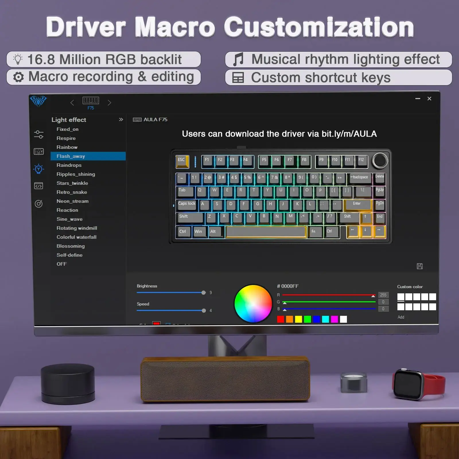 El teclado para juegos RGB AULA F75 tiene múltiples modos retroiluminados RGB que puedes cambiar fácilmente con simples atajos.Puede realizar sus efectos RGB con el software incluido.Con el software, se pueden configurar todo tipo de funciones de las teclas del teclado, grabar macro y personalizar las teclas de sus funciones como desee.La unidad de memoria flash integrada podría guardar la configuración del teclado si está fuera de línea.