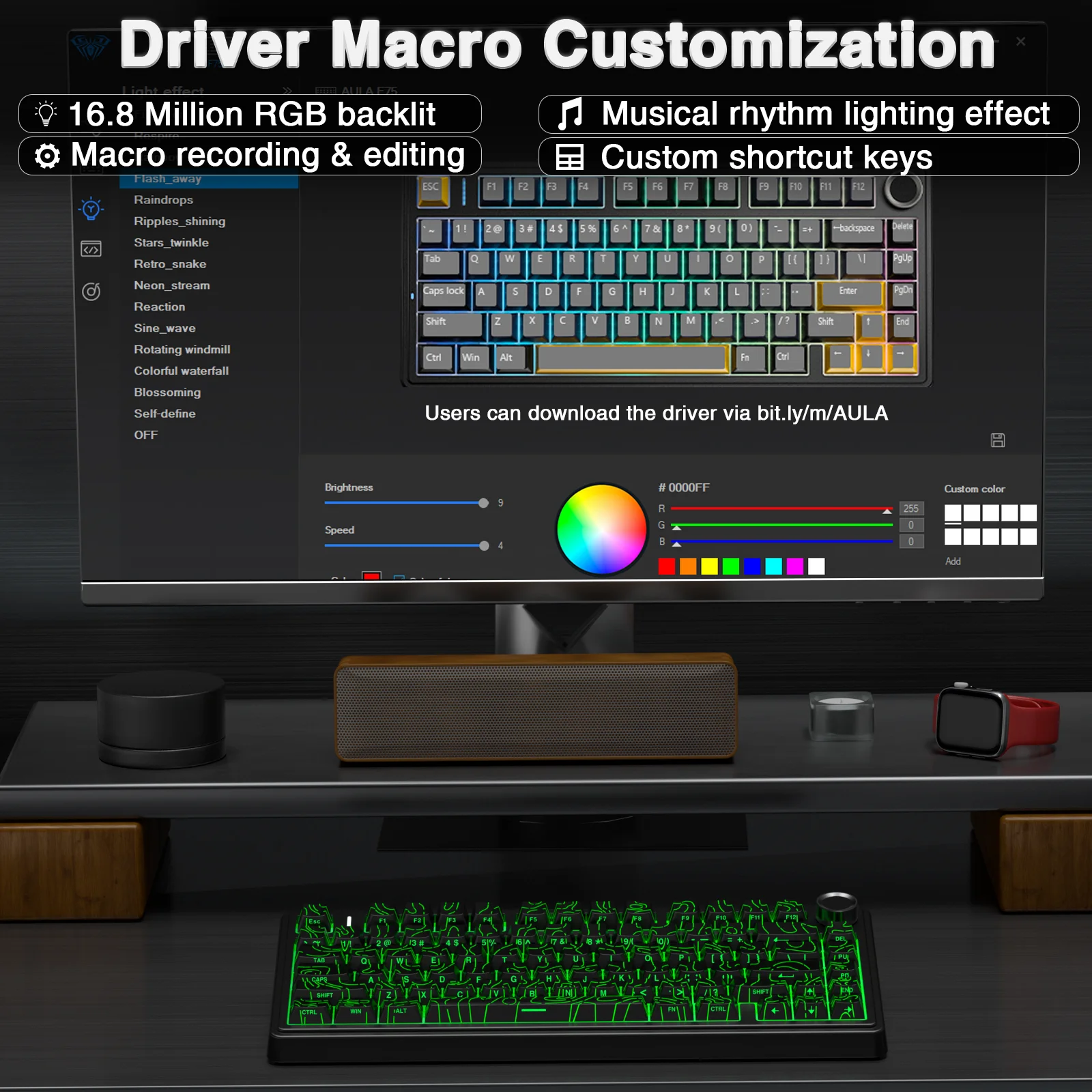 El teclado para juegos RGB AULA F75 tiene múltiples modos retroiluminados RGB que puedes cambiar fácilmente con simples atajos.Puede realizar sus efectos RGB con el software incluido.Con el software, se pueden configurar todo tipo de funciones de las teclas del teclado, grabar macro y personalizar las teclas de sus funciones como desee.La unidad de memoria flash integrada podría guardar la configuración del teclado si está fuera de línea.