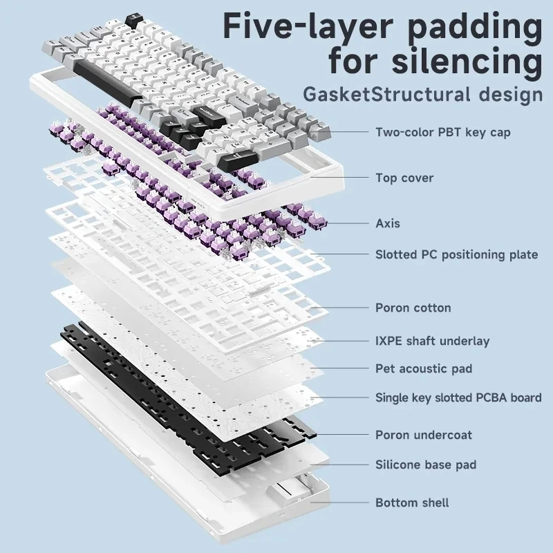 F99 es un teclado junta-montado de gama alta con una placa de la PC. El teclado también tiene unas almohadillas de silicona Premium de 5 capas y algodón de reducción de ruido para reducir el 95% de ruido hueco, ruido de mecanografía abosord, y mejorar el rebote único suave y cómodo de la estructura de la Junta.