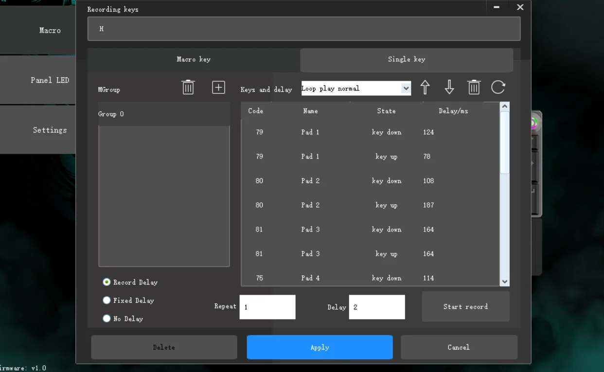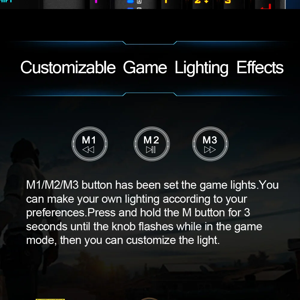 Primero presione M1 (o M2/M3), luego presione y mantenga presionado el botón M1 (o M2/M3) hasta que el indicador de la perilla parpadee y las luces de las teclas estén apagadas, puede personalizar su efecto de iluminación presionando las teclas que desea, luego presione M1 (o M2/M3) para confirmar