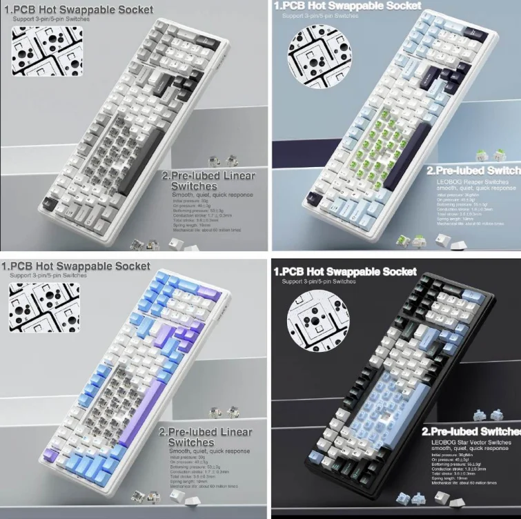 F99 is equipped with hot-swappable PCB to ensure free replacement or change of switches. It is compatible with most 3-pin and 5-pin mechanical switches. Pre-installed the pre-lubed custom switches providing unrivaled tactile responsiveness with up to 50 million keystroke lifespan.