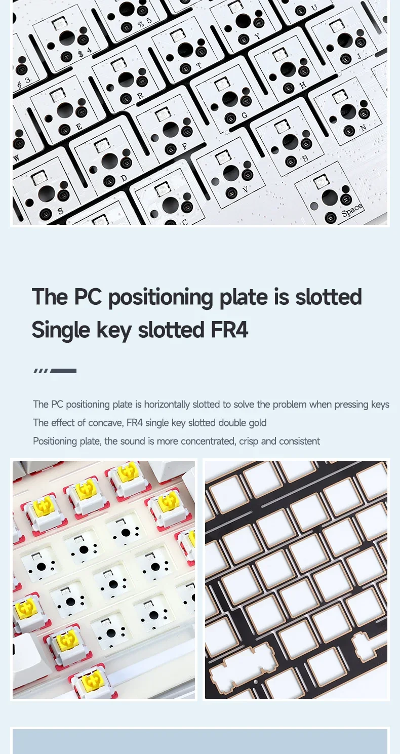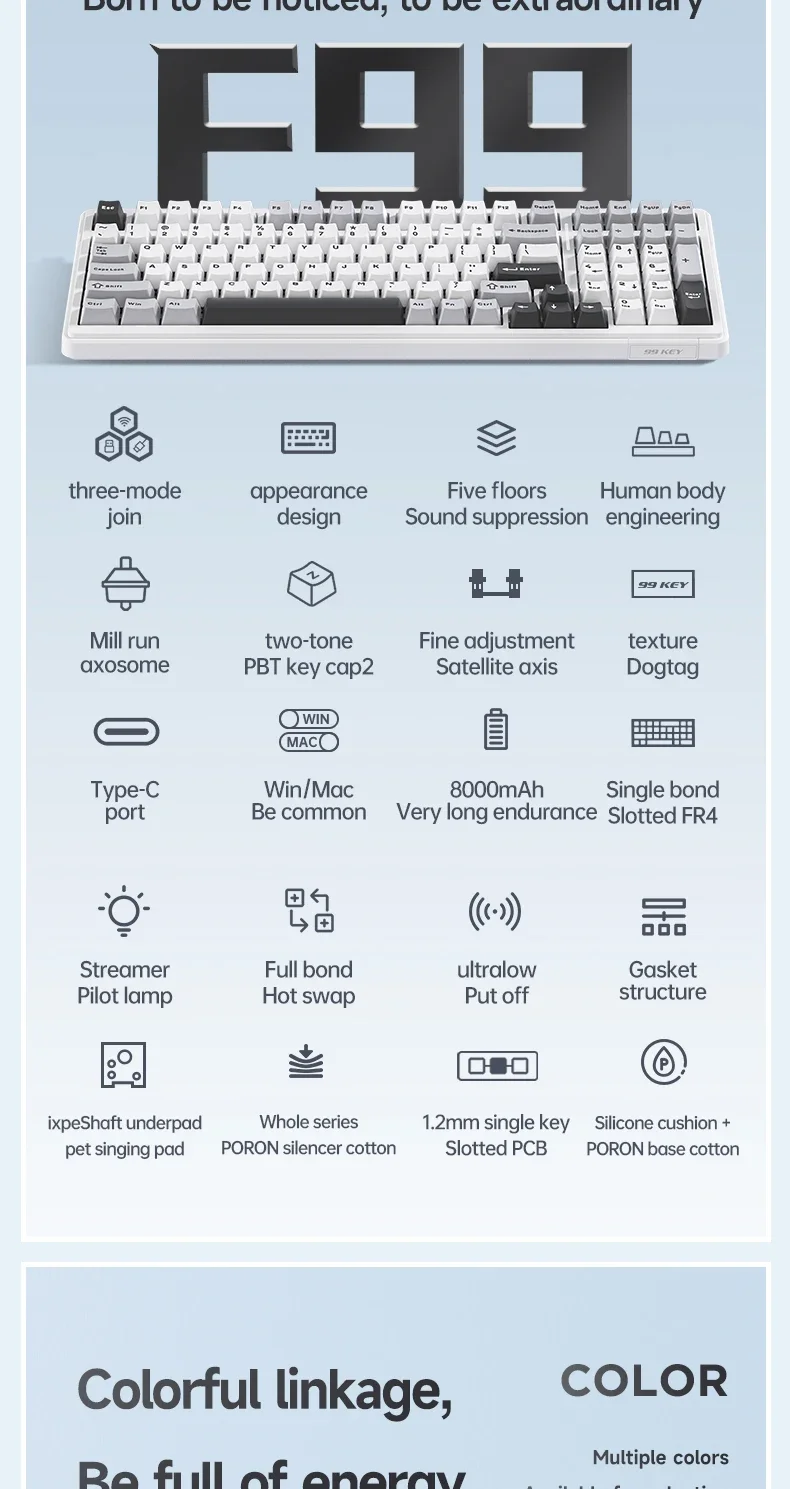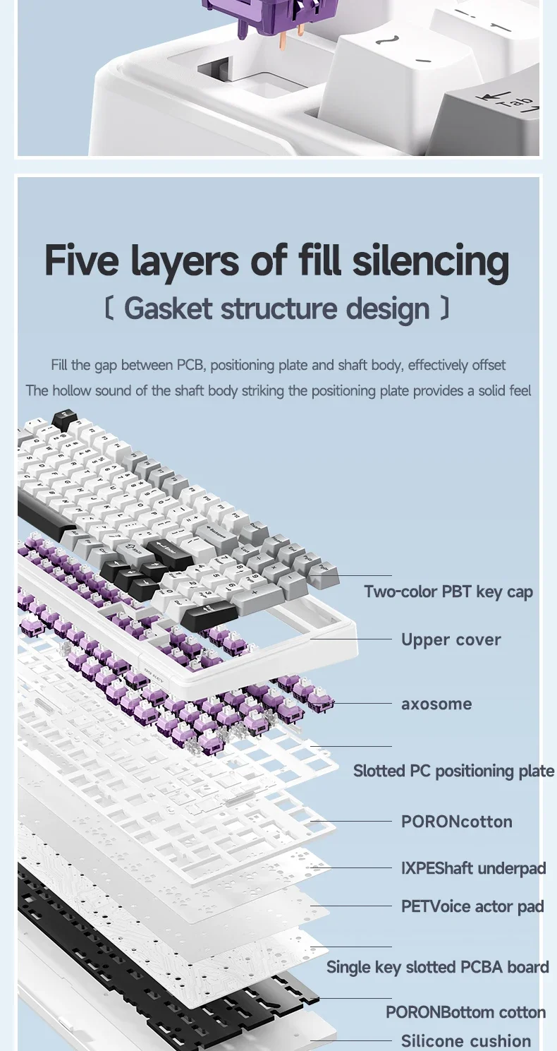 F99 es un teclado de alta gama montado en junta con placa de PC. El teclado también tiene almohadillas de silicona Premium de 5 capas y algodón con reducción de ruido para reducir el ruido hueco del 95%, absorber el ruido de escritura y mejorar el rebote suave y cómodo único de la estructura de la Junta.