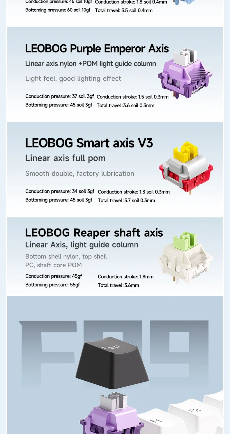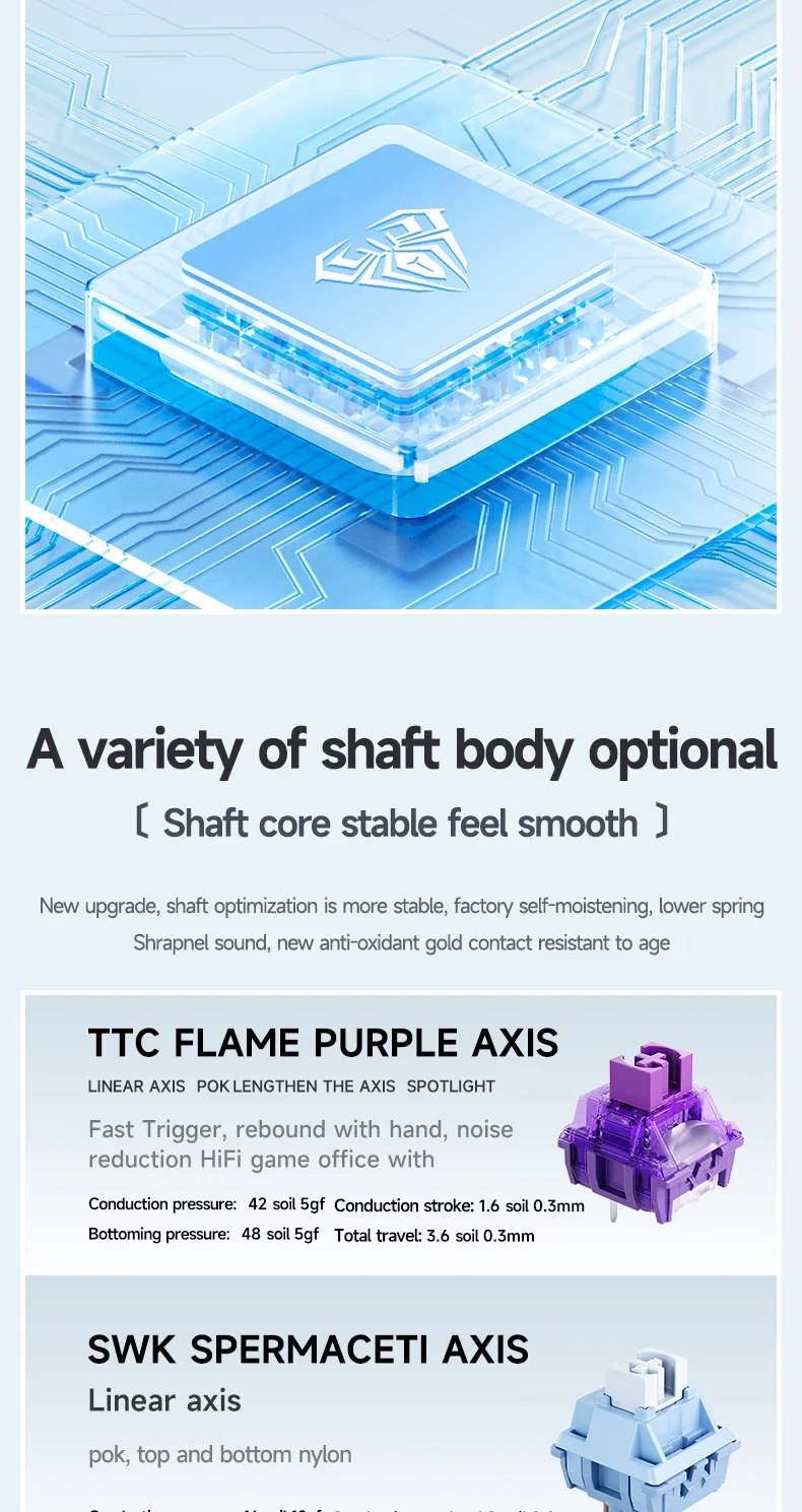 F99 está equipado con PCB intercambiable en caliente para garantizar el reemplazo o cambio gratuito de interruptores. Es compatible con la mayoría de los interruptores mecánicos de 3 y 5 pines. Los interruptores personalizados preinstalados proporcionan una respuesta táctil inigualable con una vida útil de hasta 50 millones de pulsaciones.