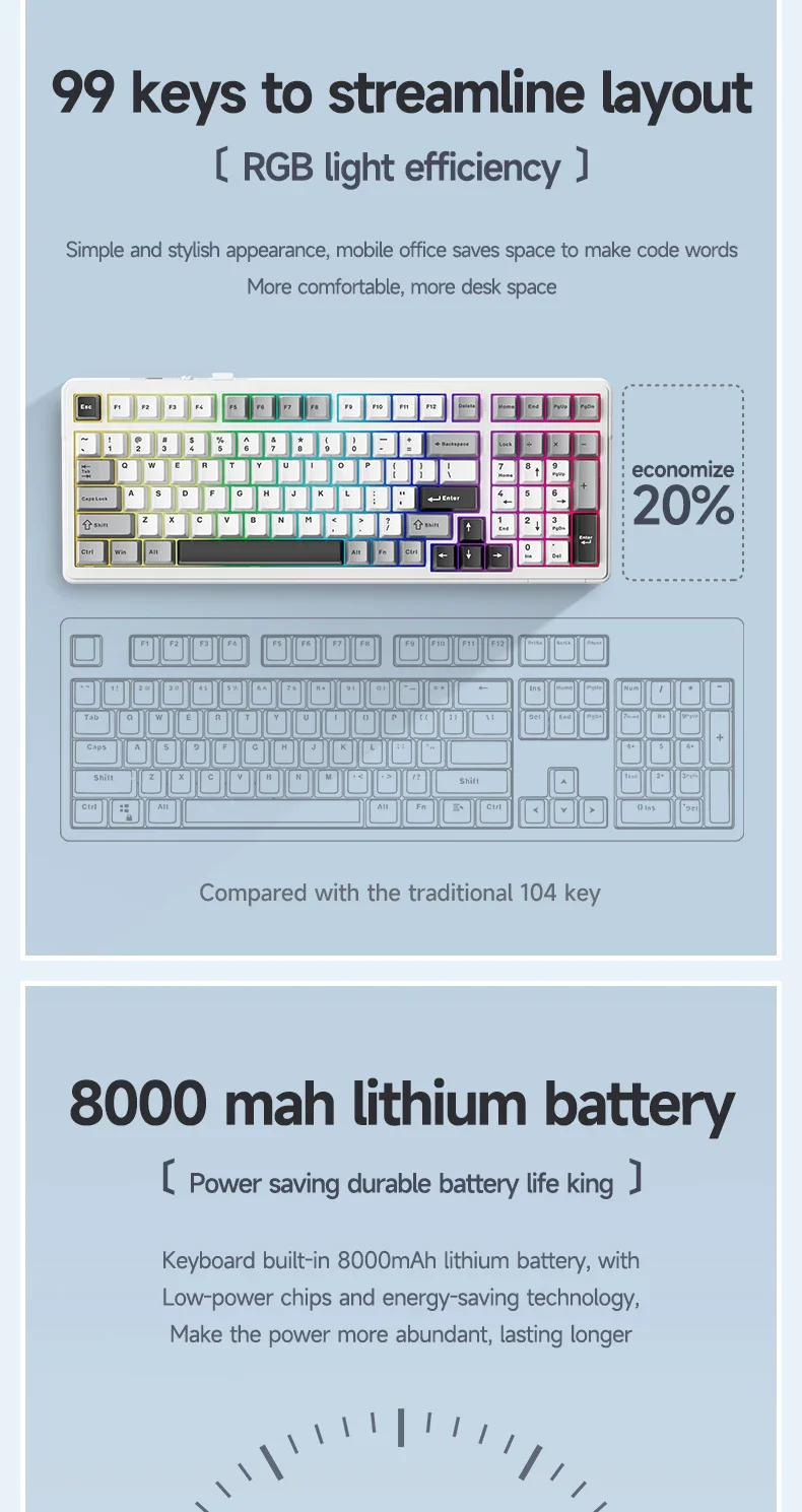 AULA F99 está equipado con una batería de litio integrada de 8000mhA de capacidad, que se puede cargar a través del cable tipo C mientras se usa en modo con cable. Cuando está completamente cargado, dura 53 horas con las luces encendidas y aproximadamente 400 horas con la luz apagada.